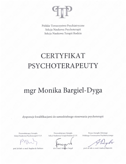 W 2015 r. zdałam egzamin potwierdzający posiadane przeze mnie kwalifikacje psychoterapeutyczne i uzyskałam certyfikat psychoterapeuty asygnowany przez Polskie Towarzystwo Psychiatryczne.