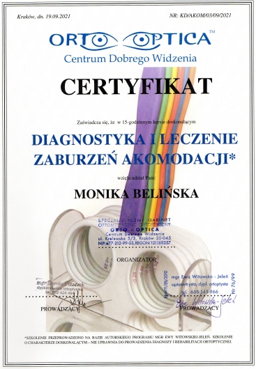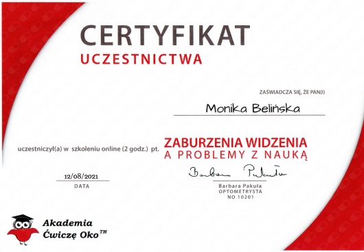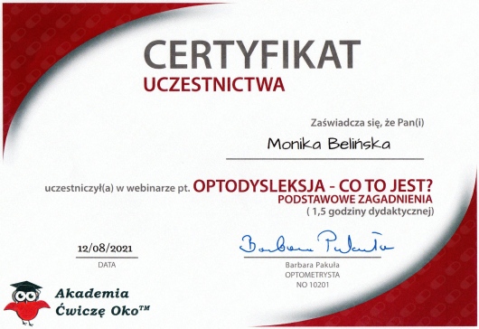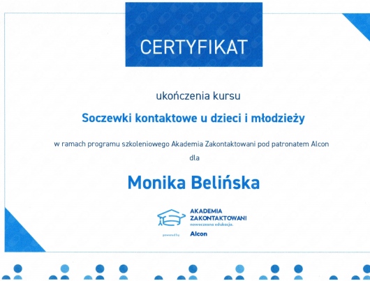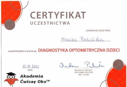 Jaki jest zakres porad oferowanych przez Monika Belińska?Monika Belińska to optometrysta. Na podstawie swojego doświadczenia i wykształcenia Monika Belińska oferuje usługi takie jak: Konsultacja optometryczna, badania diagnostyczne, dobór soczewek kontaktowych miękkich, Badanie wzroku + dobór okularów, badanie OCT, Badanie oraz dobór soczewek kontaktowych, Wizyta kontrolna po badaniu wzroku, badanie wzroku u dzieci, Badanie wzroku dzieci z doborem soczewek kontaktowych, Wizyta kontrolna dzieci po badaniu wzroku.