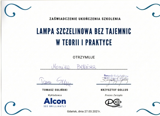 Zajmuje się diagnostyką optometryczną dorosłych i dzieci. Po ukończonych pierwszych studiach z Optometrii, od 2024 kontynuuje edukację na studiach magisterskich na Uniwersytecie im. Adama Mickiewicza w Poznaniu. Stale poszerzam swoją wiedzę uczestnicząc w licznych kursach i szkoleniach skierowanych do specjalistów. W mojej pracy potrzeby wzrokowe Pacjenta są najważniejsze. Obecnie poszerzam swój obszar zainteresowań w kierunku terapii widzenia, szczególnie w zakresie heteroforii z zaburzeniami akomodacji. Jeśli zauważyłaś/eś u siebie lub swojego dziecka: - problemy z koncentracją/ trudności w nauce - pogorszone widzenie na dal/bliż - czasami obraz się wyostrza czasami pogarsza - występują bóle oczu, bóle głowy To zapraszam Cię na konsultację - dobierzemy odpowiednią korekcję oraz w razie potrzeby odpowiednie ćwiczenia.