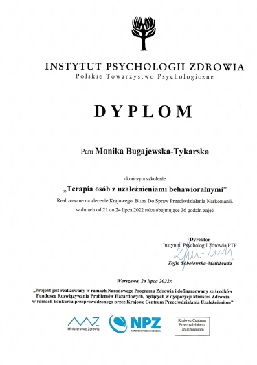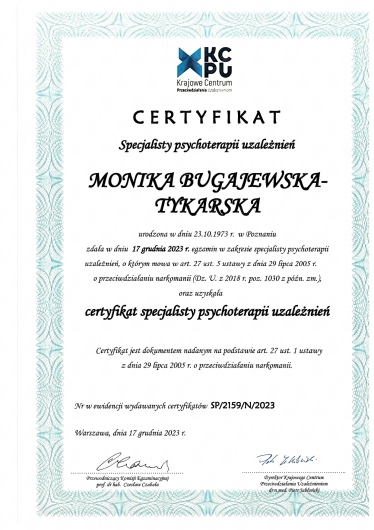 Jaki jest zakres porad oferowanych przez Monika Bugajewska-Tykarska?Monika Bugajewska-Tykarska to psychoterapeuta. Na podstawie swojego doświadczenia i wykształcenia Monika Bugajewska-Tykarska oferuje usługi takie jak: Psychoterapia, konsultacja psychoterapeutyczna (pierwsza wizyta), psychoterapia uzależnień, psychoedukacja, Terapia uzależnień on-line, Psychoterapia uzależnień i współuzależnienia, konsultacja online, psychoterapia online, konsultacja online (pierwsza), konsultacja online (kolejna).