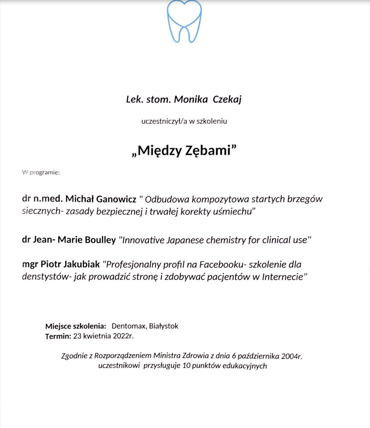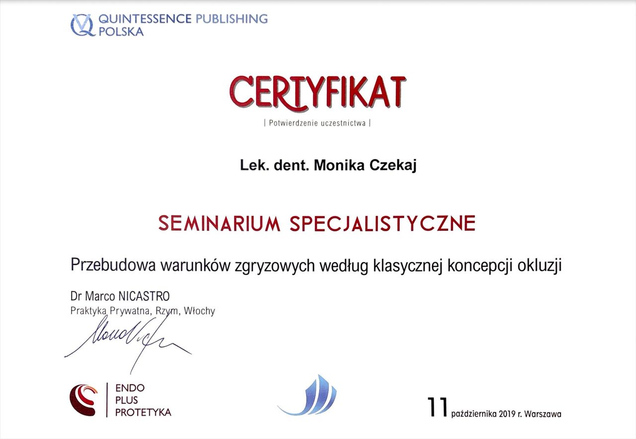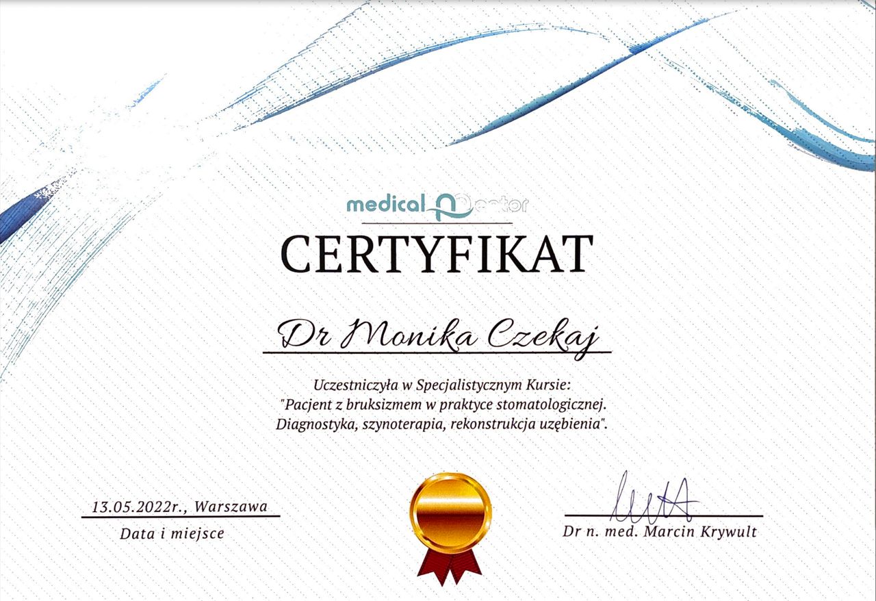 Jaki jest zakres porad oferowanych przez Monika Czekaj?Monika Czekaj to stomatolog. Na podstawie swojego doświadczenia i wykształcenia Monika Czekaj oferuje usługi takie jak: Konsultacja stomatologiczna, pakiet higienizacyjny, RTG pantomogram, znieczulenie, szyna relaksacyjna, Wypełnienie.