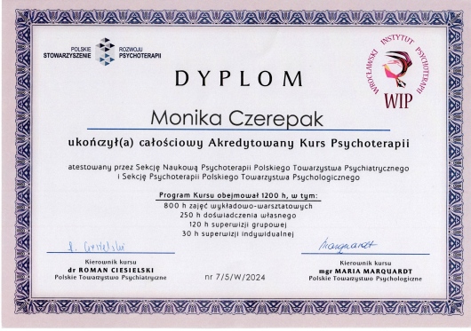 Jaki jest zakres porad oferowanych przez Monika Czerepak?Monika Czerepak to psychoterapeuta. Na podstawie swojego doświadczenia i wykształcenia Monika Czerepak oferuje usługi takie jak: psychoedukacja, Psychoterapia, psychoterapia depresji, konsultacja psychoterapeutyczna, Konsultacja psychodietetyczna, psychoterapia DDA, psychoterapia zaburzeń odżywiania, psychoterapia traumy, psychoterapia psychodynamiczna, Psychoterapia zaburzeń obsesyjno-kompulsyjnych OCD.
