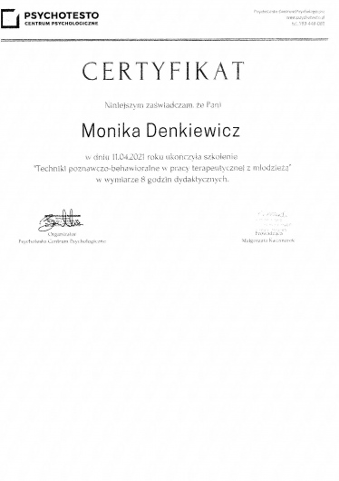 Pani Monika jest osobą bardzo zaangażowana w pacjenta, empatyczna, posiada dużą wiedzę. Pomaga nakierować pacjenta żeby wyciągał wnioski samodzielnie, zadając trafne pytania. Zachęca do pracy własnej nad sobą w czasie wolnym od wizyt, podsyła pomocne materiały.