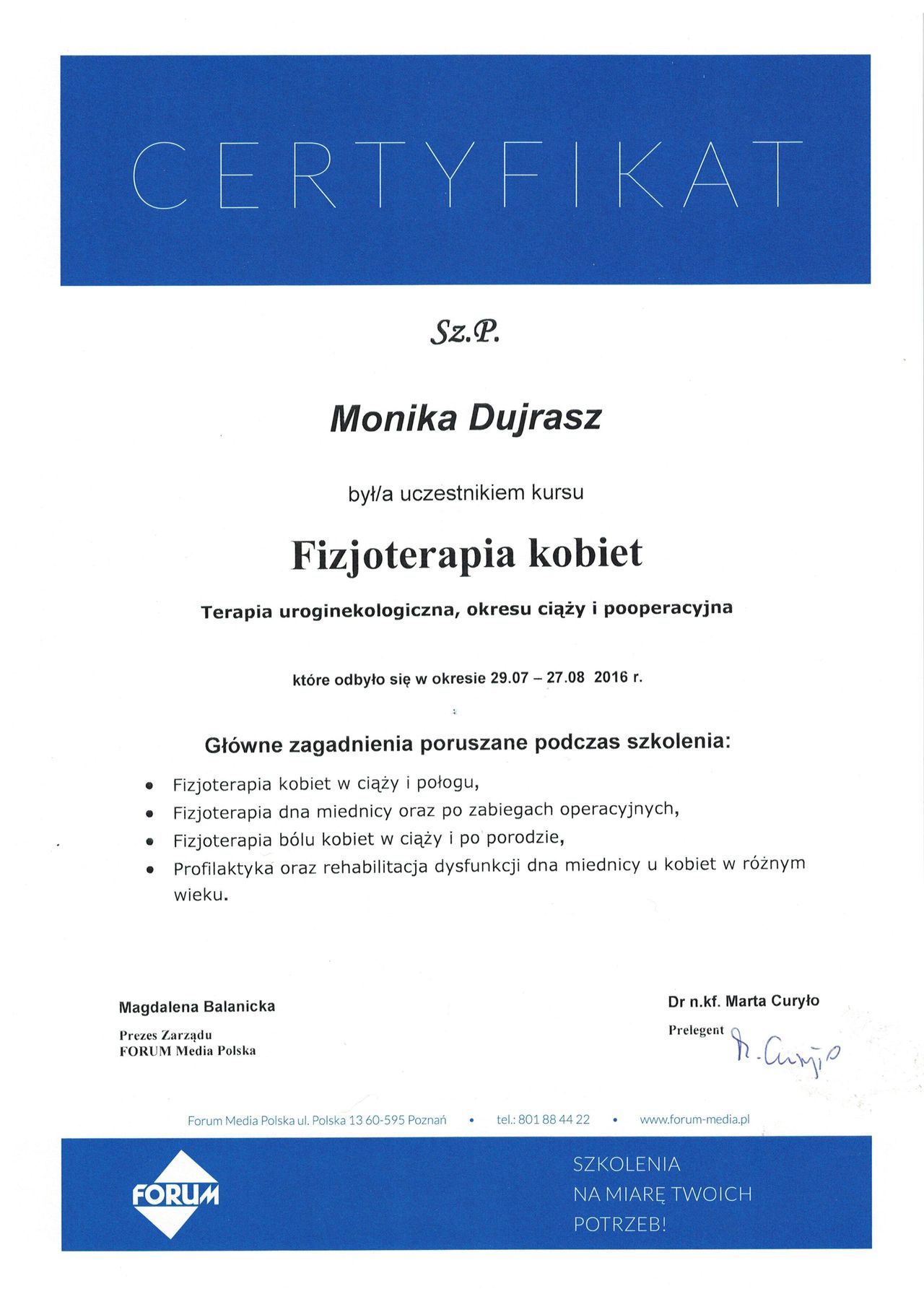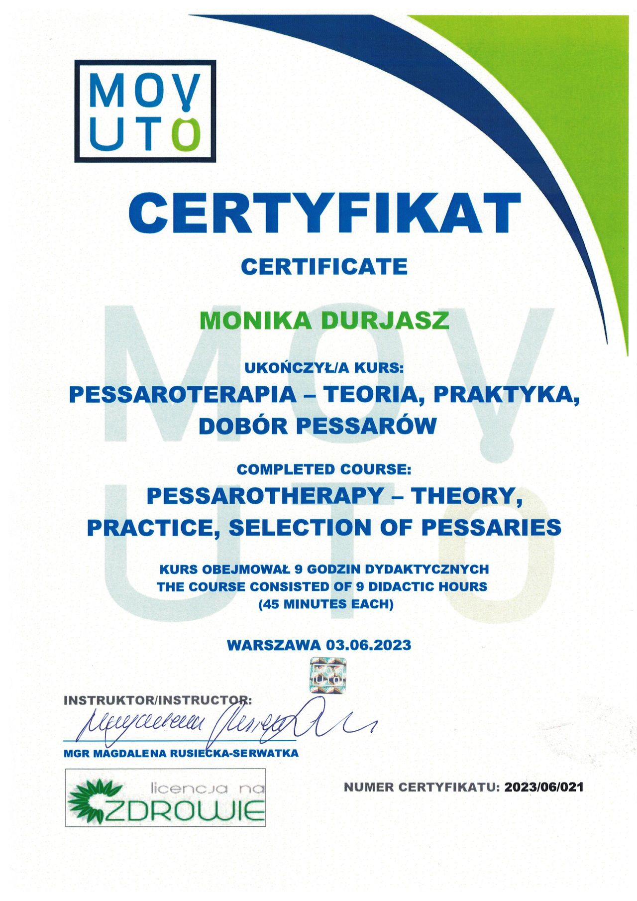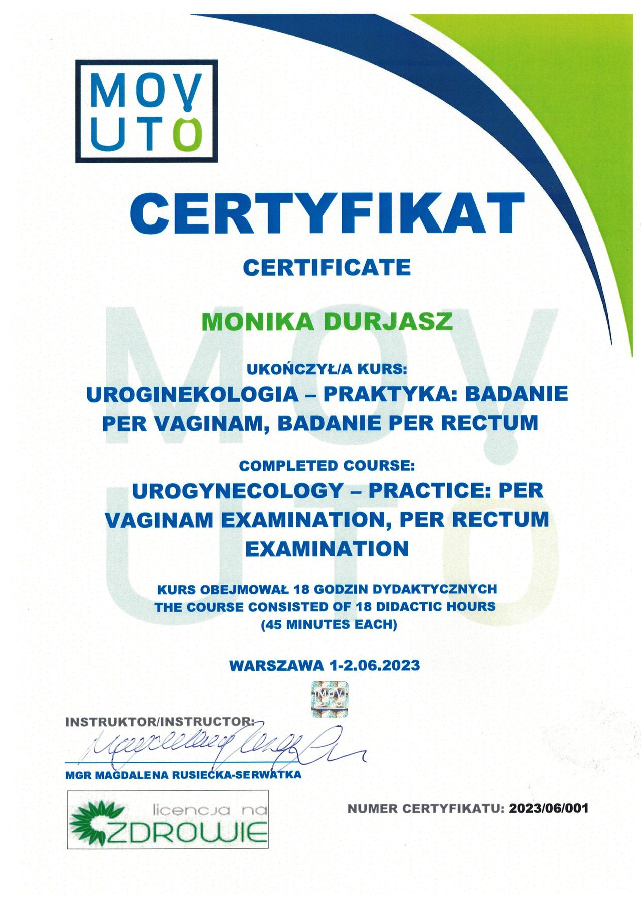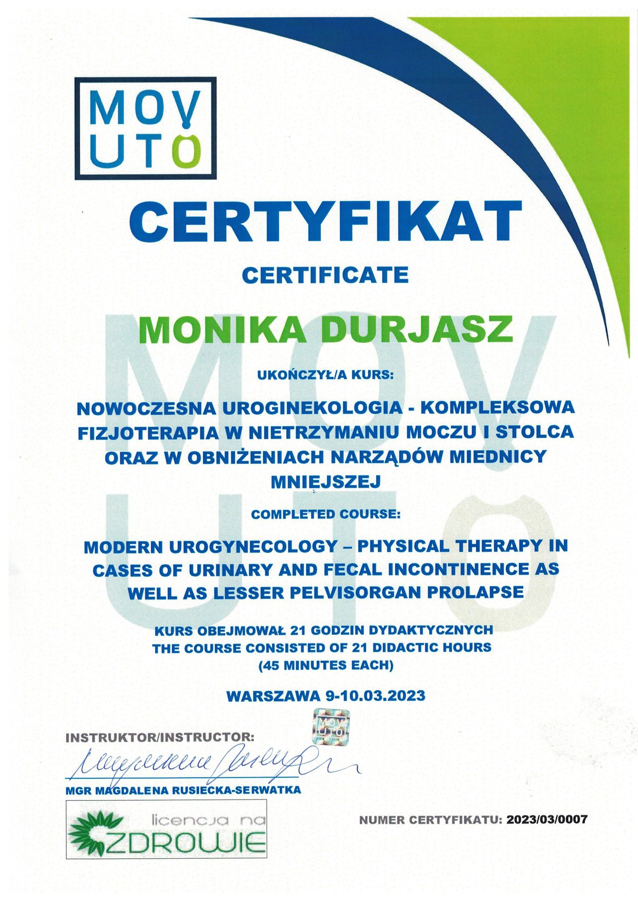 Ukończone kursy: - Badanie i terapia tkanek miekkich 2014 - Anatomy Trains 2016 - Fizjoterapia kobiet,terapia uroginekologiczna, okresu ciąży i pooperacyjna 2016 - Kompleksowa terapia przeciwobrzękowa 2016 - Modern Orthopaedic Medicine Cyriax,module B 2018 - Modern Orthopaedic Medicine Cyriax, module A 2018 - Modern OrthopaedicMedicine Cyriax, module C 2018 - Flossingw terapii i treningu 2018 - FMT Blades IASTM 2019 - Bolesne miesiączkowanie oraz endometrioza 2019 - Dry Needling wg FRSc moduł 1 2021 - Blizna-terapia kompleksowa 2021 - Dry Needling wgFRSc moduł 2 2021 - GRAL I-medycyna manualna 2021 - Ciąża, przygotowanie do porodu i opieka poporodowa w ujęciu osteopatycznym 2022 - Nowoczesna uroginekologia-kompleksowa fizjoterapia w nietrzymaniu moczu i stolca w obniżeniach narządów miednicy mniejszej 2023 - Uroginekologia: badanie per vagina, badanie per rectum 2023 - Pessaroterapia-teoria, praktyka, dobór pessarów 2023