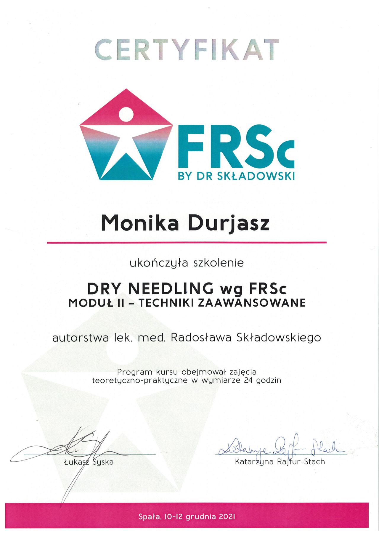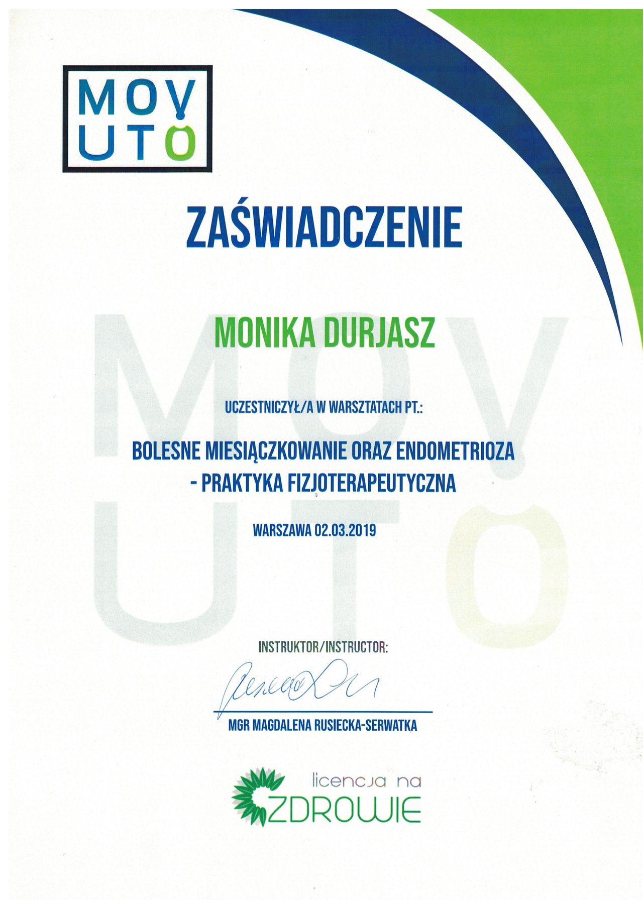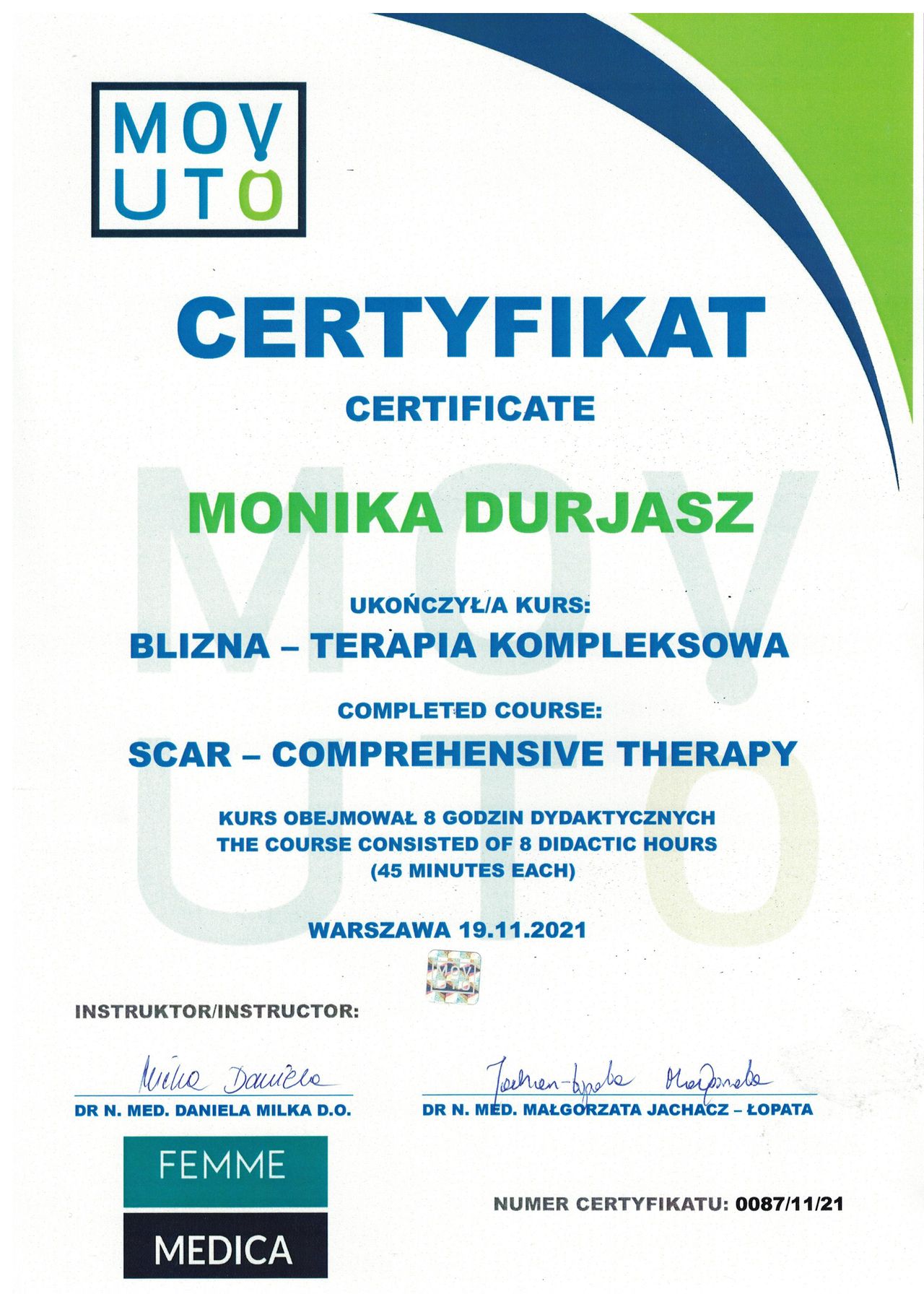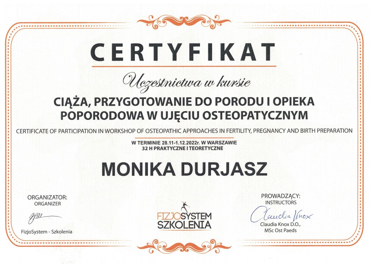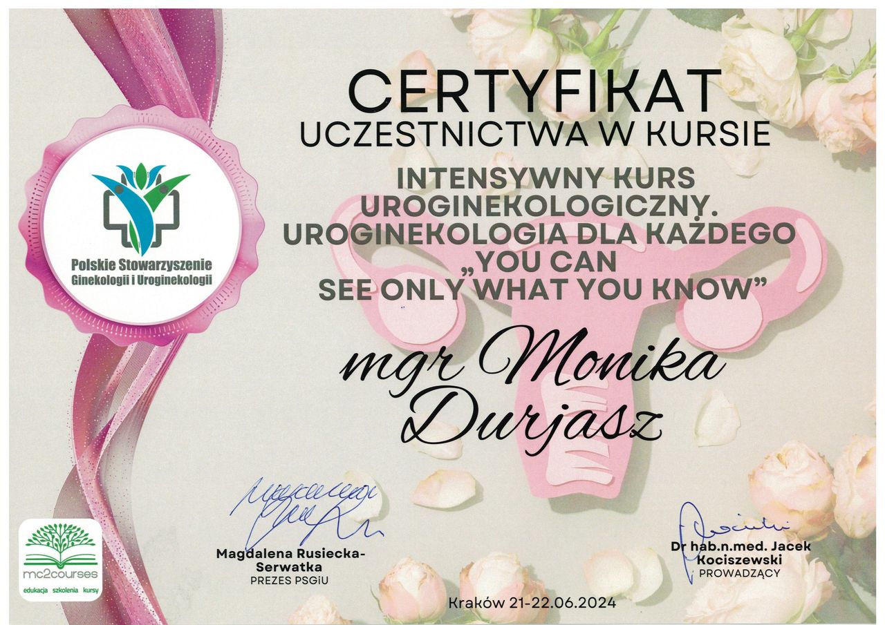 Ukończone kursy: - Badanie i terapia tkanek miekkich 2014 - Anatomy Trains 2016 - Fizjoterapia kobiet,terapia uroginekologiczna, okresu ciąży i pooperacyjna 2016 - Kompleksowa terapia przeciwobrzękowa 2016 - Modern Orthopaedic Medicine Cyriax,module B 2018 - Modern Orthopaedic Medicine Cyriax, module A 2018 - Modern OrthopaedicMedicine Cyriax, module C 2018 - Flossingw terapii i treningu 2018 - FMT Blades IASTM 2019 - Bolesne miesiączkowanie oraz endometrioza 2019 - Dry Needling wg FRSc moduł 1 2021 - Blizna-terapia kompleksowa 2021 - Dry Needling wgFRSc moduł 2 2021 - GRAL I-medycyna manualna 2021 - Ciąża, przygotowanie do porodu i opieka poporodowa w ujęciu osteopatycznym 2022 - Nowoczesna uroginekologia-kompleksowa fizjoterapia w nietrzymaniu moczu i stolca w obniżeniach narządów miednicy mniejszej 2023 - Uroginekologia: badanie per vagina, badanie per rectum 2023 - Pessaroterapia-teoria, praktyka, dobór pessarów 2023
