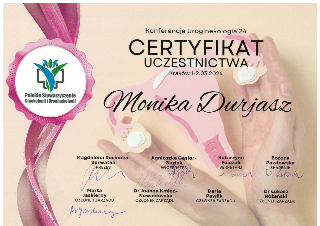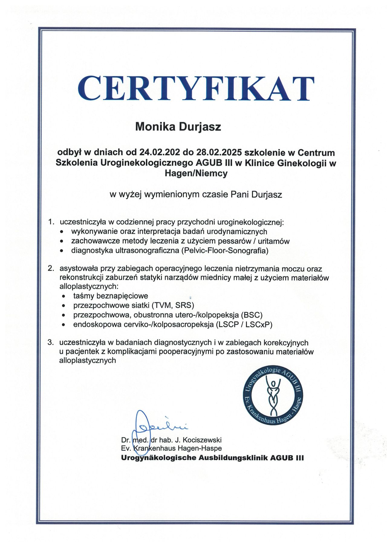 Swoje doświadczenie poszerzałam m.in. podczas stażu w Evangelisches Krankenhaus Hagen-Haspe w Niemczech pod opieką dr hab. n. med. Jacka Kociszewskiego - jednego z najbardziej cenionych ekspertów w dziedzinie ginekologii. Ponadto jestem członkinią Polskiego Stowarzyszenia Ginekologii i Uroginekologii.