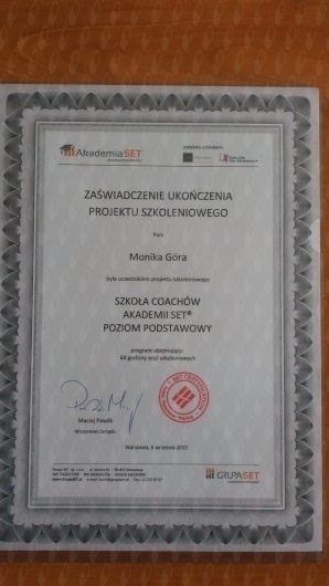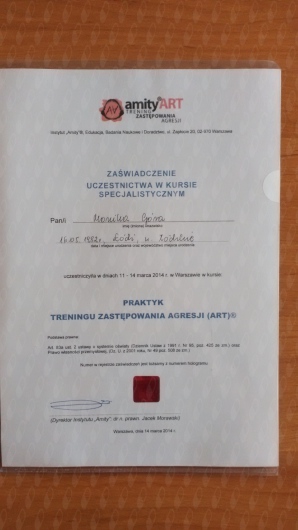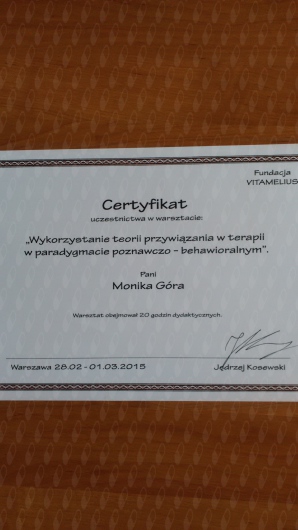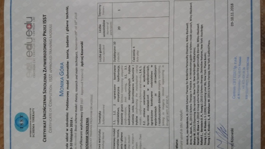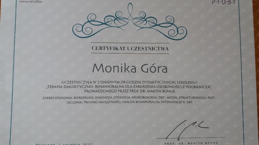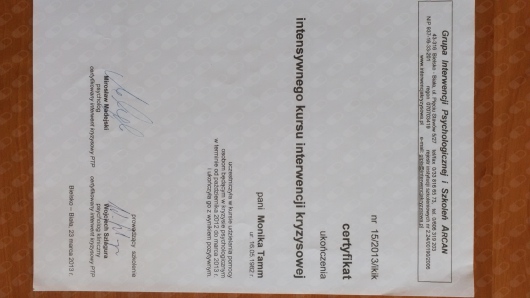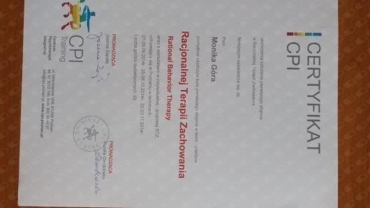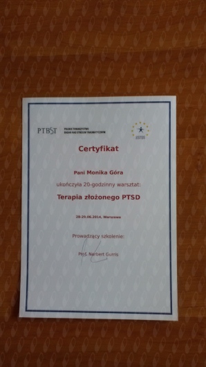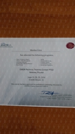 Jestem psychologiem, coachem, terapeutą EMDR oraz interwentem kryzysowym. Ukończyłam wydział psychologii Uniwersytetu Humanistyczno-Społecznego SWPS w Warszawie ze specjalnością psycholog kliniczny oraz Szkołę Coachów Akademii SET. Zostałam przeszkolona z Terapii Schematów, Interwencji Kryzysowej, terapii par prowadzonej w nurcie poznawczo- behawioralnym, Racjonalnej Terapii Zachowania (RTZ) oraz Terapii Dialektyczno - Behawioralnej (TDB) pod okiem prof. Martina Bohus. Brałam udział w warsztatach organizowanych przez Polskie Towarzystwo Badań nad Stresem Traumatycznym ("Terapia Złożonego PTSD i zaburzeń z nim powiązanych" pod kierownictwem prof. N. Gurrisa) oraz szkoleniach Terapii Poznawczo - Behawioralnej CBT, nurtu z którego na ogół w pracy z klientami czerpię najwięcej. Uczestniczyłam w Treningu Zastępowania Agresji ART, szkoliłam się w zakresie przeciwdziałania przemocy w rodzinie i pomocy psychologicznej dorosłym ofiarom przemocy. Jestem certyfikowanym terapeutą EMDR Europe, przeszkolonym dodatkowo do pracy z przedstawicielami służb mundurowych (EMDR Protocol Treating Combat PTSD - szkolenie specjalistyczne prowadzone przez Theodore Olejnik, psychoterapeutę Armii Amerykańskiej w USA (Certyfikat EMDR International Association). Członek Polskiego Towarzystwa Badań nad Stresem Traumatycznym. W pracy kieruje się Kodeksem Etyczno-Zawodowym Psychologa.