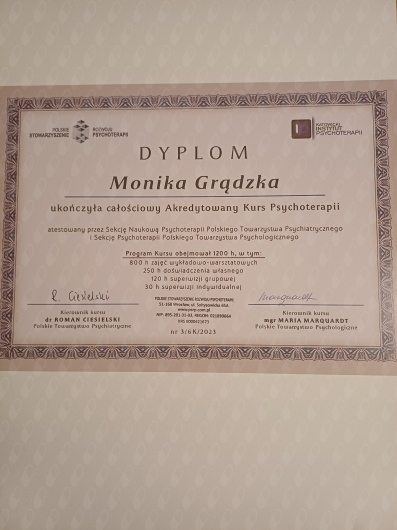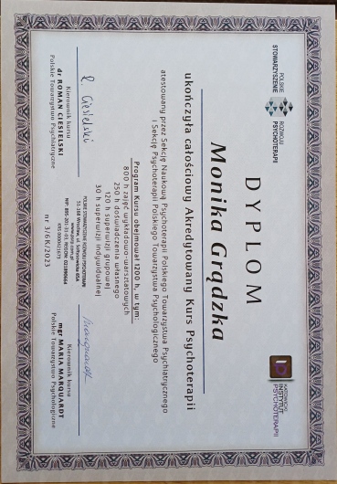 Stale poszerzam swoje umiejętności korzystając z kursów, szkoleń i konferencji. Swoją pracę poddaję regularnym superwizjom.