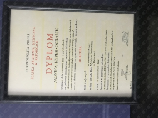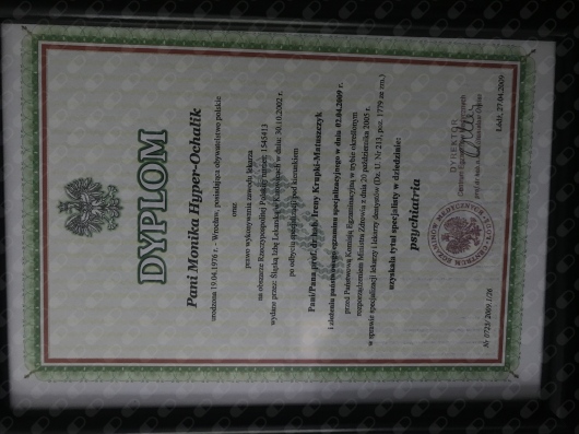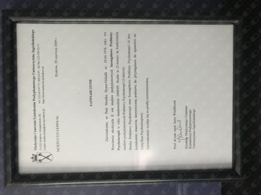W 2009 roku zdobyłam tytuł specjalistki Psychiatry. Ukończyłam studia podyplomowe w zakresie psychoterapii w podejściu psycho-dynamicznym w 2005 roku na CMUJ.