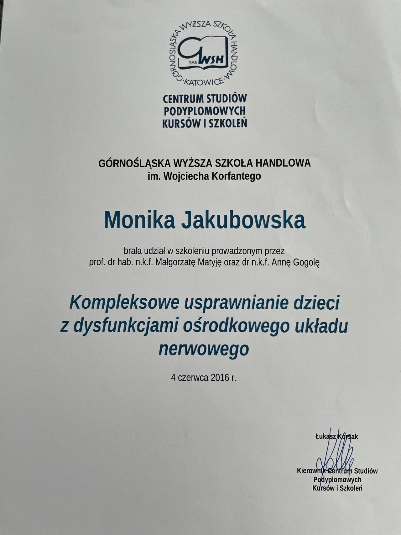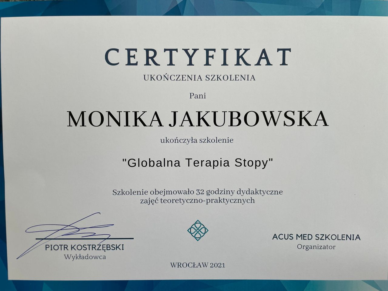 Ukończyłam studia z fizjoterapii na Akademii Wychowania Fizycznego we Wrocławiu w 2006 roku.