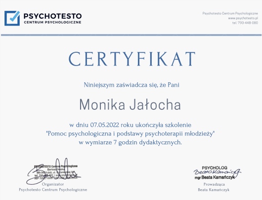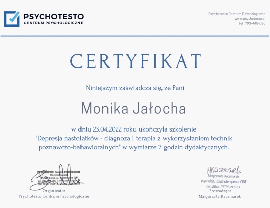 Jestem psycholożką oraz psychoterapeutką w trakcie całościowego szkolenia w nurcie poznawczo-behawioralnym. Należę do Polskiego Towarzystwa Terapii Poznawczej i Behawioralnej (PTTPB).