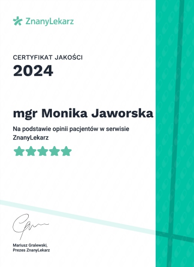 Jak Monika Jaworska umawia wizyty?Monika Jaworska używa kalendarza ZnanyLekarz, dlatego na stronie widzisz aktualne terminy. Wystarczy, że wybierzesz datę i godzinę, które odpowiadają Ci najbardziej. Umawianie wizyty jest darmowe, a tuż przed terminem wyślemy Ci przypomnienie.