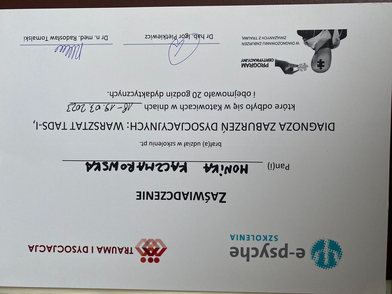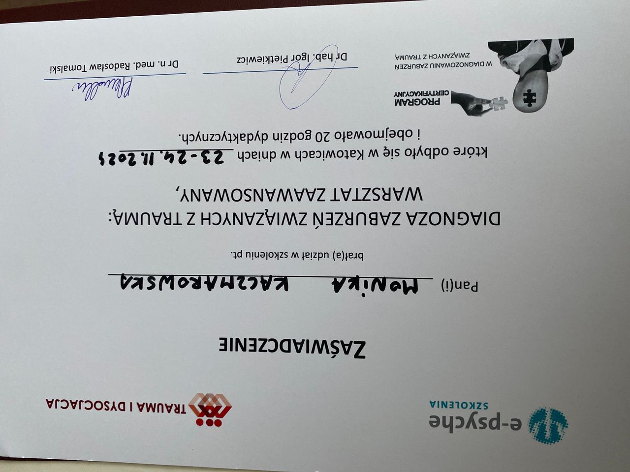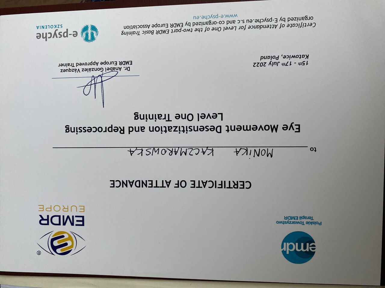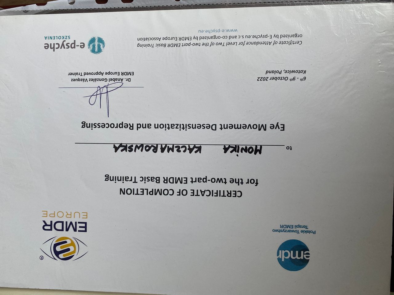 Jestem psychologiem, psychotraumatologiem, certyfikowaną specjalistką psychoterapii uzależnień, terapeutką EMDR, psychoterapeutką (nurt integracyjny). Ponadto ukończyłam kursy w obszarze terapii traumy, diagnozy i terapii zaburzeń dysocjacyjnych oraz całościowe szkolenie z Dialogu Motywującego w Polskim Instytucie Dialogu Motywującego. Prowadzę konsultację oraz psychoterapię indywidualną. Swoją pracę poddaje systematycznej superwizji.