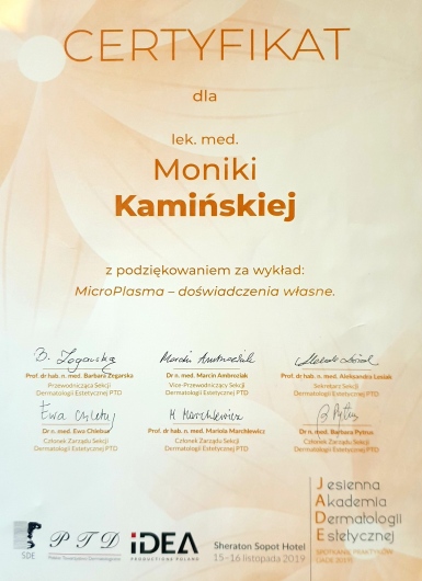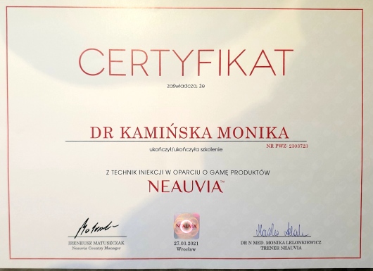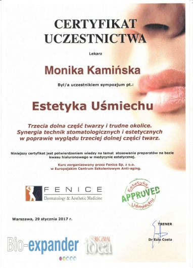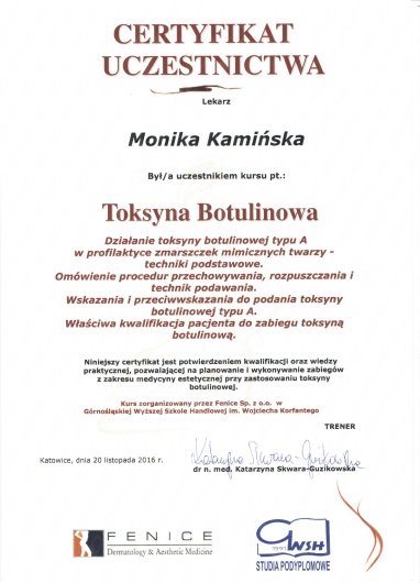 Jaki jest zakres porad oferowanych przez Monika Kamińska?Monika Kamińska to stomatolog, lekarz wykonujący zabiegi medycyny estetycznej. Na podstawie swojego doświadczenia i wykształcenia Monika Kamińska oferuje usługi takie jak: Botoks, zabieg medycyny estetycznej, medycyna estetyczna, Kwas hialuronowy, Nici APTOS, mezoterapia, usuwanie brodawek, usuwanie znamion, Konsultacja z zakresu medycyny estetycznej, leczenie powikłań po zabiegach estetycznych (rozpuszczanie kwas, usuwanie nici).