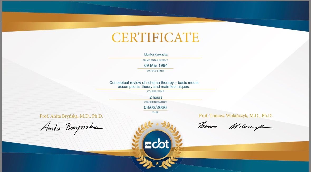 Jestem psychologiem, terapeutą EMDR, z wieloletnim doświadczeniem w pracy z osobami w kryzysach. W 2008r ukończyłam studia psychologiczne i od tego czasu pracuję w zawodzie zajmując się interwencją kryzysową, poradnictwem, terapią psychologiczną, psychoprofilatyką, oraz prowadzeniem szkoleń. W roku 2012 ukończyłam studia podyplomowe z zakresu psychologii transportu, a w 2014r. Studium Przeciwdziałania Przemocy w Rodzinie. Odbyłam również staż kliniczny w Oddziale Leczenia Uzależnień Szpitala MSWiA w Otwocku. Kompetencje terapeutyczne doskonalę na kursie transkulturowej psychoterapii pozytywnej prowadzonym przez Wrocławski Instytut Psychoterapii. Dbając o dobro pacjentów stale podnoszę własne kwalifikacje uczestnicząc także w licznych szkoleniach związanych m.in. z tematyką interwencji kryzysowej, zagrożenia suicydalnego, czy stresu. Aktualnie skupiam się przede wszystkim na pracy jako interwent kryzysowy i terapeuta EMDR w obszarze szeroko rozumianej traumy, zarówno sytuacyjnej, jak i relacyjnej.