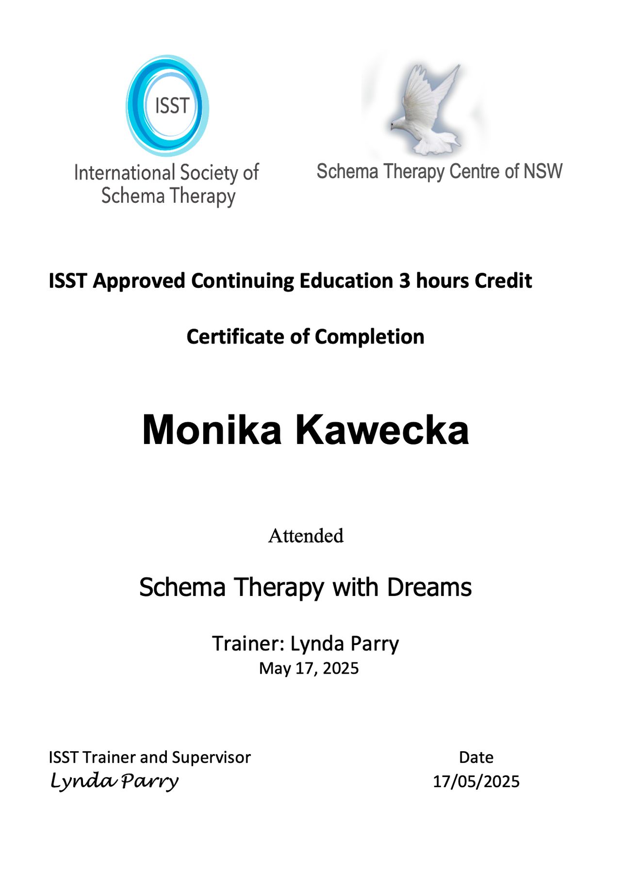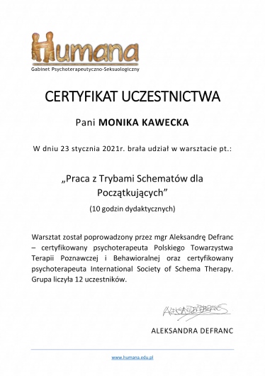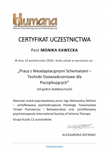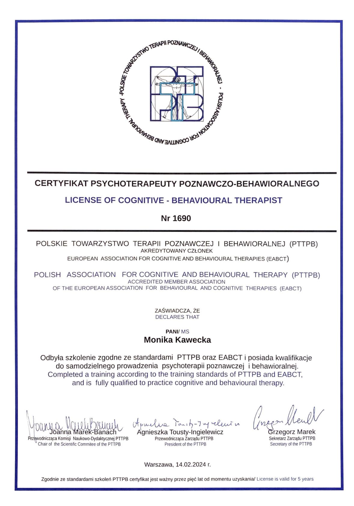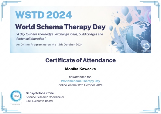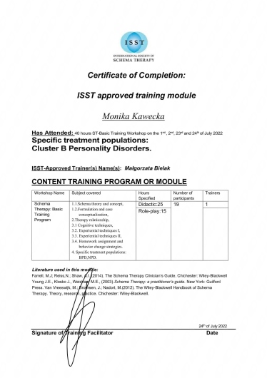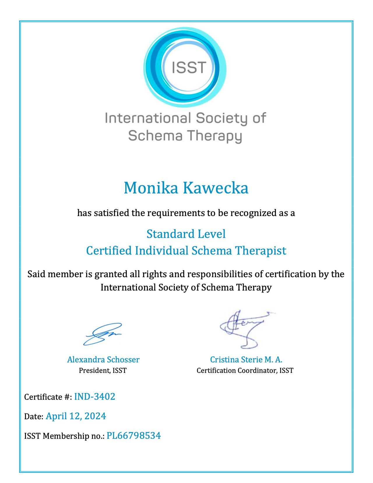 Jestem psychologiem oraz certyfikowaną psychoterapeutką w dwóch nurtach: poznawczo-behawioralnym (certyfikat nr 1690 PTTPB) i terapii schematu (certyfikat nr IND-3402 ISST).