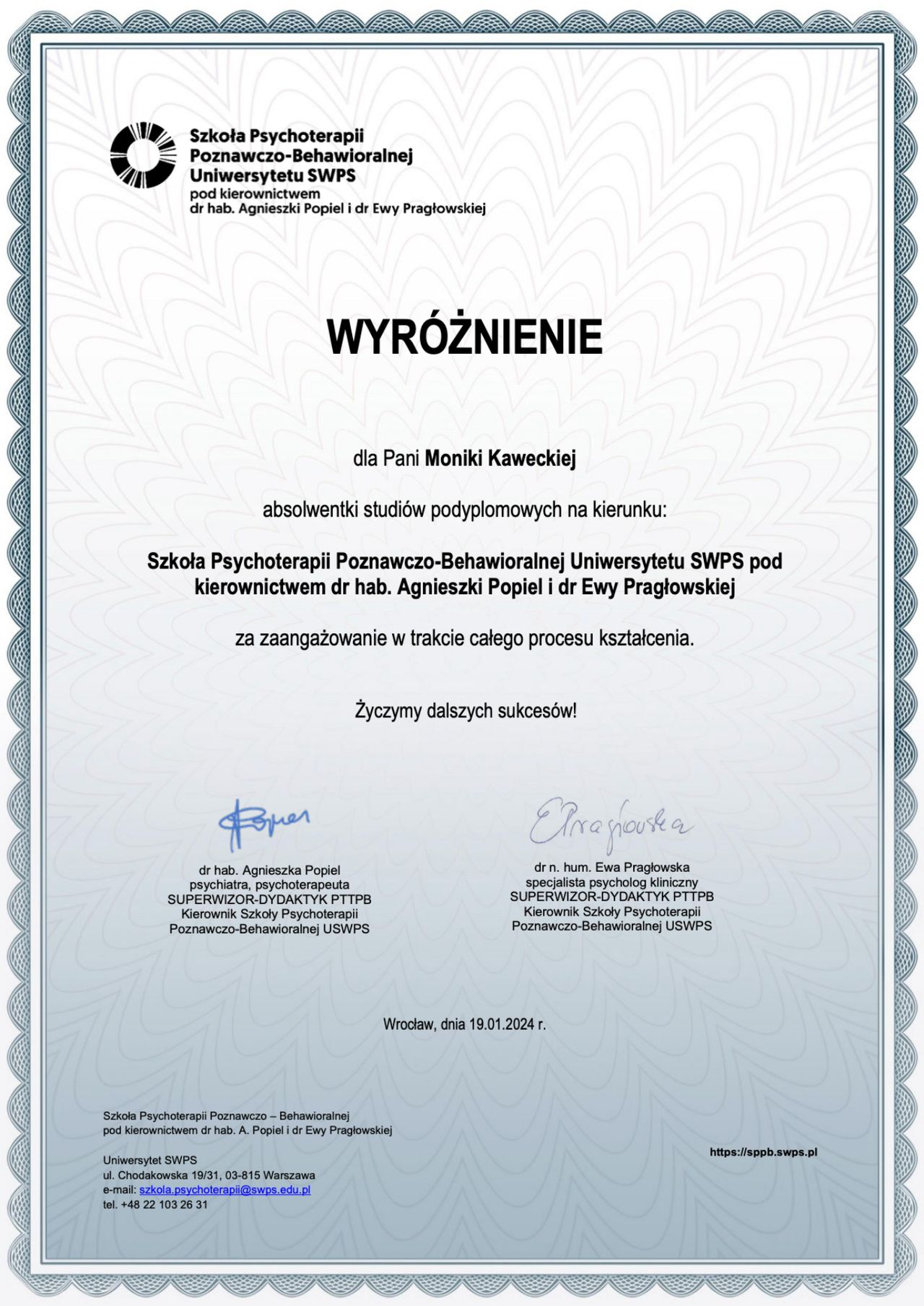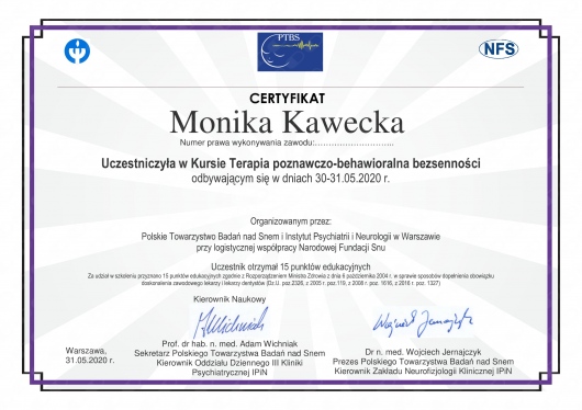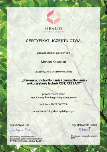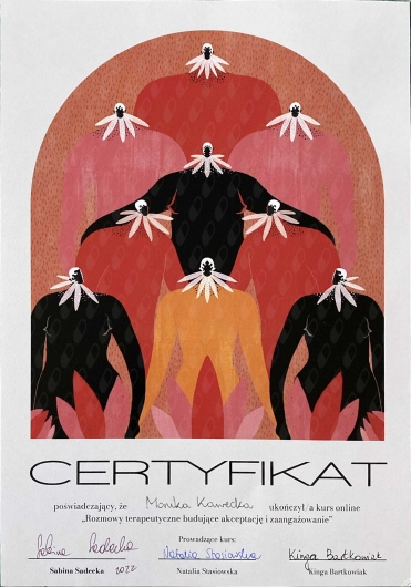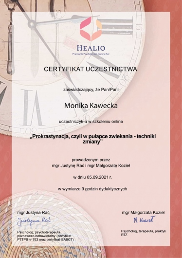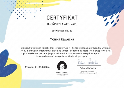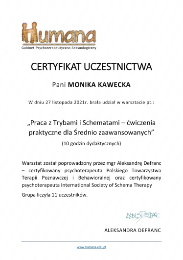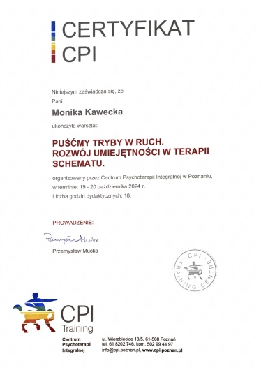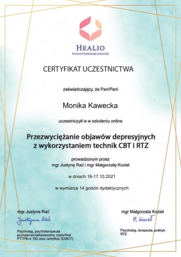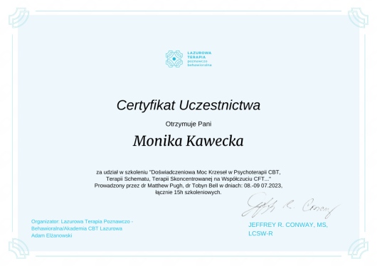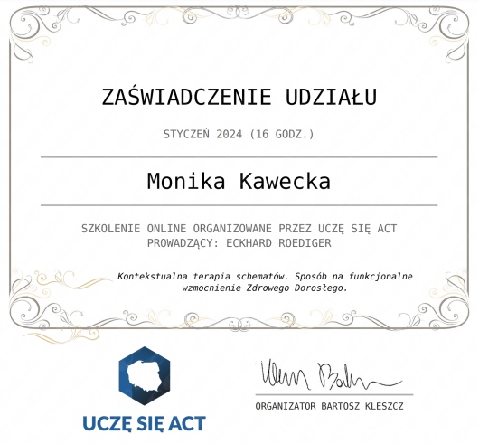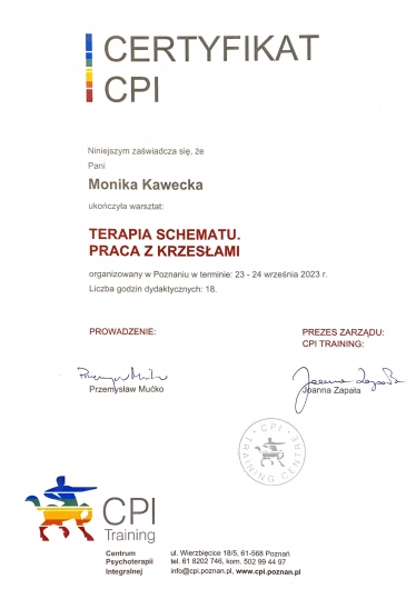 Jestem psychologiem oraz certyfikowaną psychoterapeutką w dwóch nurtach: poznawczo-behawioralnym (certyfikat nr 1690 PTTPB) i terapii schematu (certyfikat nr IND-3402 ISST).