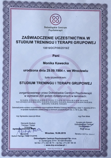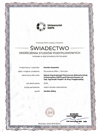 Ukończyłam 5-letnie studia magisterskie na kierunku psychologia (specjalność kliniczna) na Uniwersytecie SWPS, a następnie z wyróżnieniem czteroletnią Szkołę Psychoterapii Poznawczo-Behawioralnej Uniwersytetu SWPS we Wrocławiu oraz całościowe szkolenie z Terapii Schematu akredytowane przez ISST.