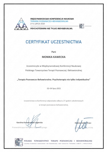 Jestem członkiem Polskiego Towarzystwa Terapii Poznawczej i Behawioralnej (PTTPB) należącego do European Association for Behavioural and Cognitive Therapies (EABCT) oraz członkiem International Society of Schema Therapy (ISST).