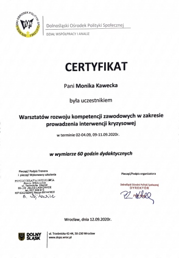Jaki jest zakres porad oferowanych przez Monika Kawecka?Monika Kawecka to psycholog, psychoterapeuta certyfikowany. Na podstawie swojego doświadczenia i wykształcenia Monika Kawecka oferuje usługi takie jak: psychological consultation in English online, konsultacja online, interwencja kryzysowa, Psychoterapia, psychoterapia zaburzeń osobowości, Terapia schematów, Psychoterapia poznawczo-behawioralna.