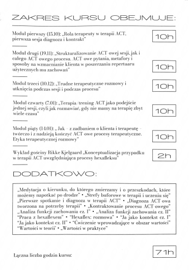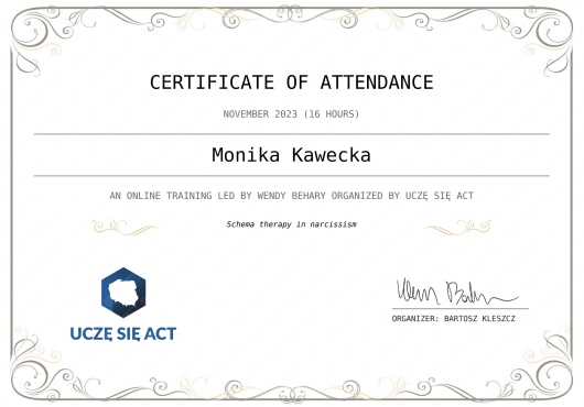 Regularnie rozwijam swoje kompetencje, uczestnicząc w szkoleniach i konferencjach międzynarodowych, szczególnie z zakresu terapii schematu oraz terapii akceptacji i zaangażowania (ACT). Pracuję online z osobami dorosłymi, zarówno w języku polskim, jak i angielskim. Swoją pracę terapeutyczną niezmiennie prowadzę pod stałą superwizją – w nurcie poznawczo-behawioralnym oraz terapii schematu.