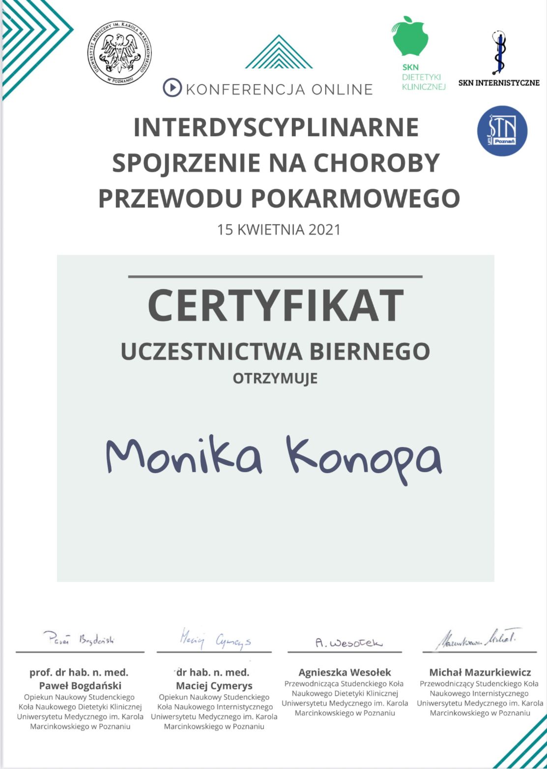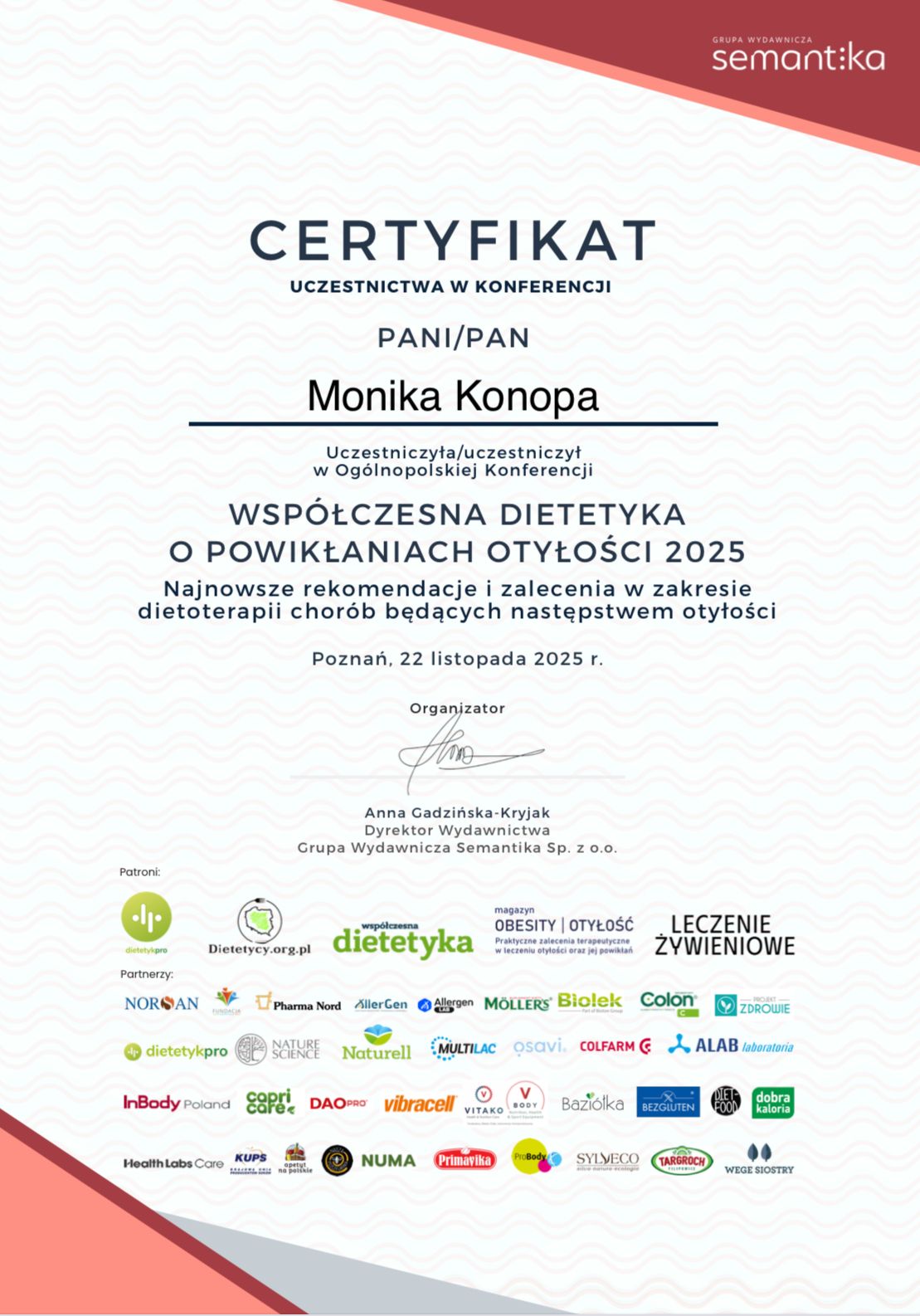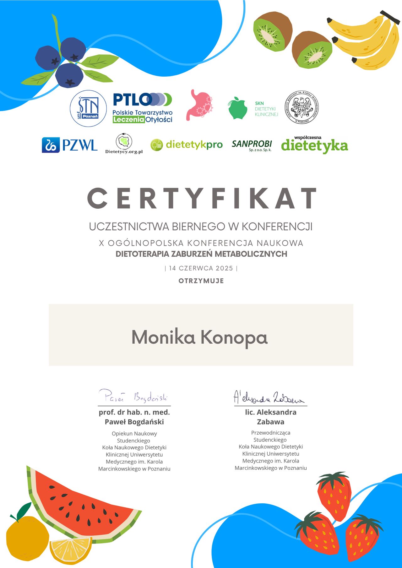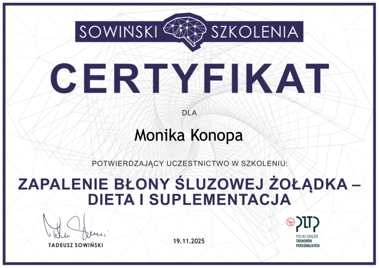 Obecnie jestem w trakcie studiów podyplomowych z zakresu psychodietetyki, które pozwalają mi jeszcze lepiej rozumieć emocjonalne i psychologiczne aspekty relacji z jedzeniem oraz skuteczniej wspierać pacjentów w trwałej zmianie nawyków żywieniowych.