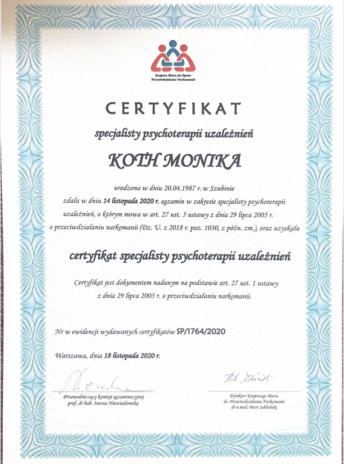 Jestem certyfikowanym psychoterapeutą uzależnień.