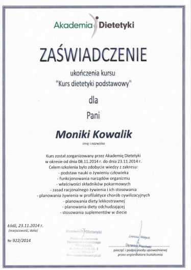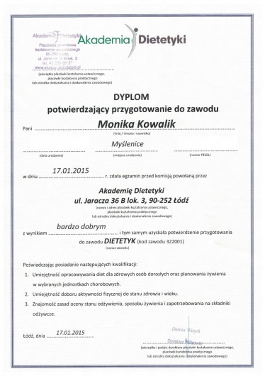 Pani Monika jest godnym polecenia dietetykiem. Trafiłam do niej z córką, która cierpi na zaburzenia odżywiania. Pani Monika nie tylko w sposób profesjonalny podeszła do leczenia, ale także na każdym jego etapie okazała wiele ciepła i wsparcia, które miało bardzo pozytywny wpływ na postępy w walce z chorobą. Bardzo empatyczna i pomocna osoba.