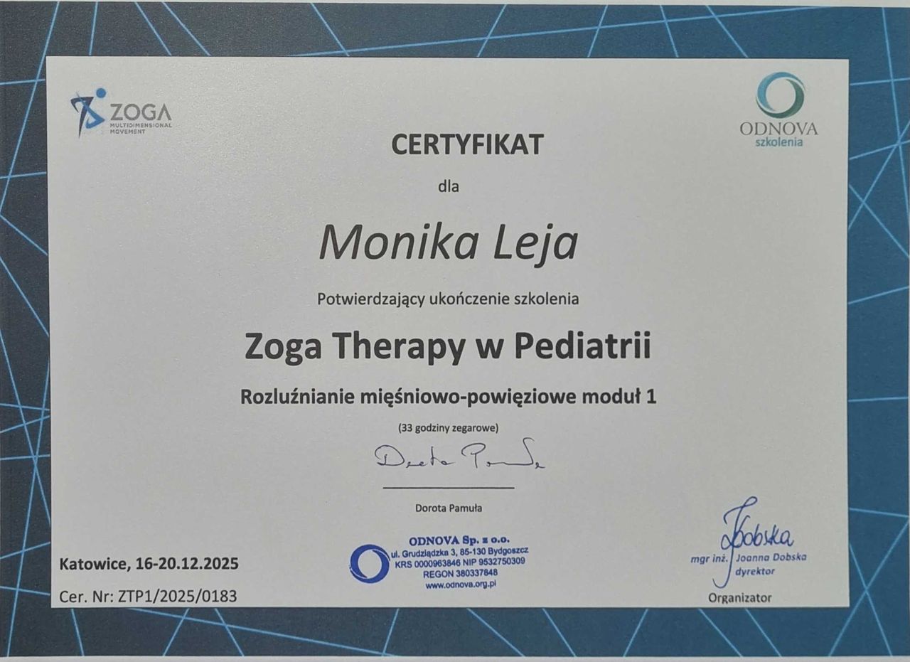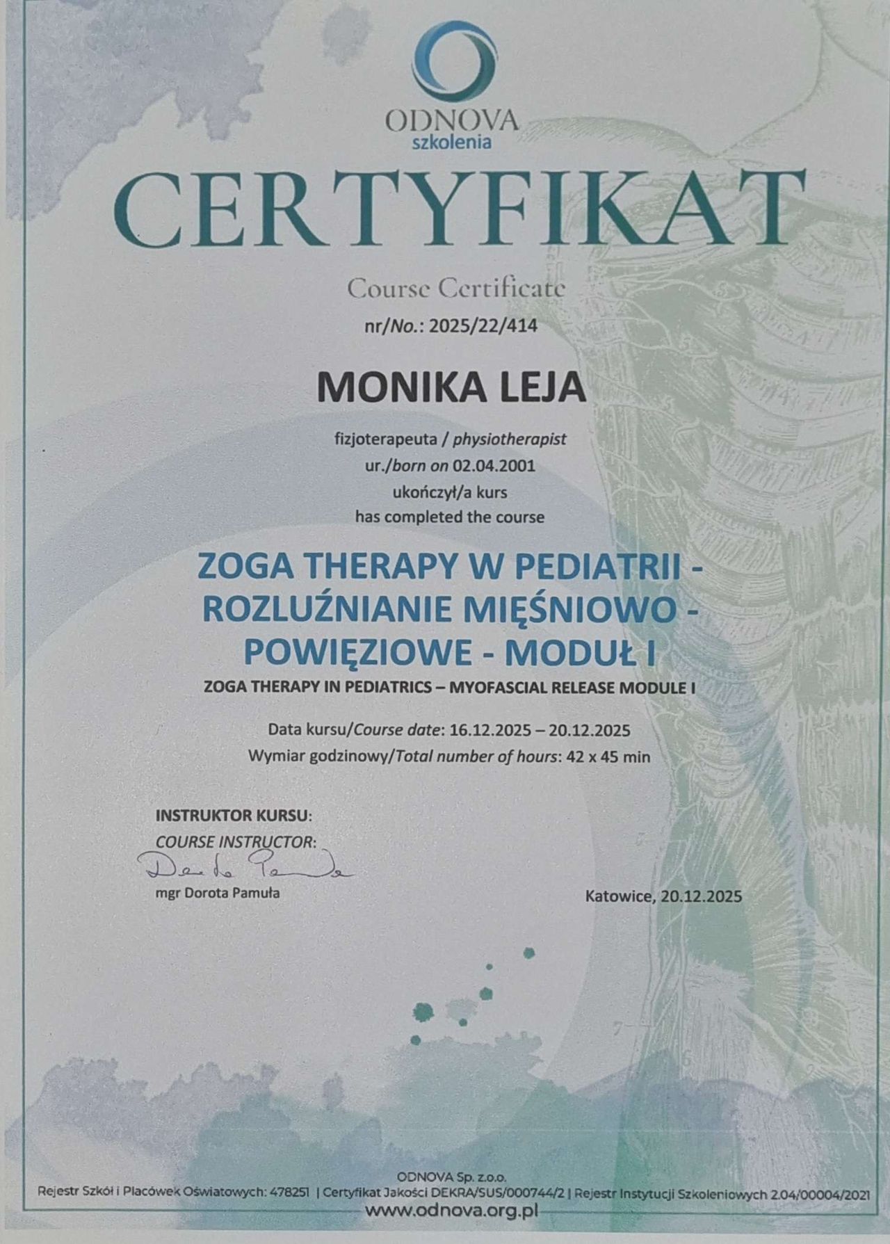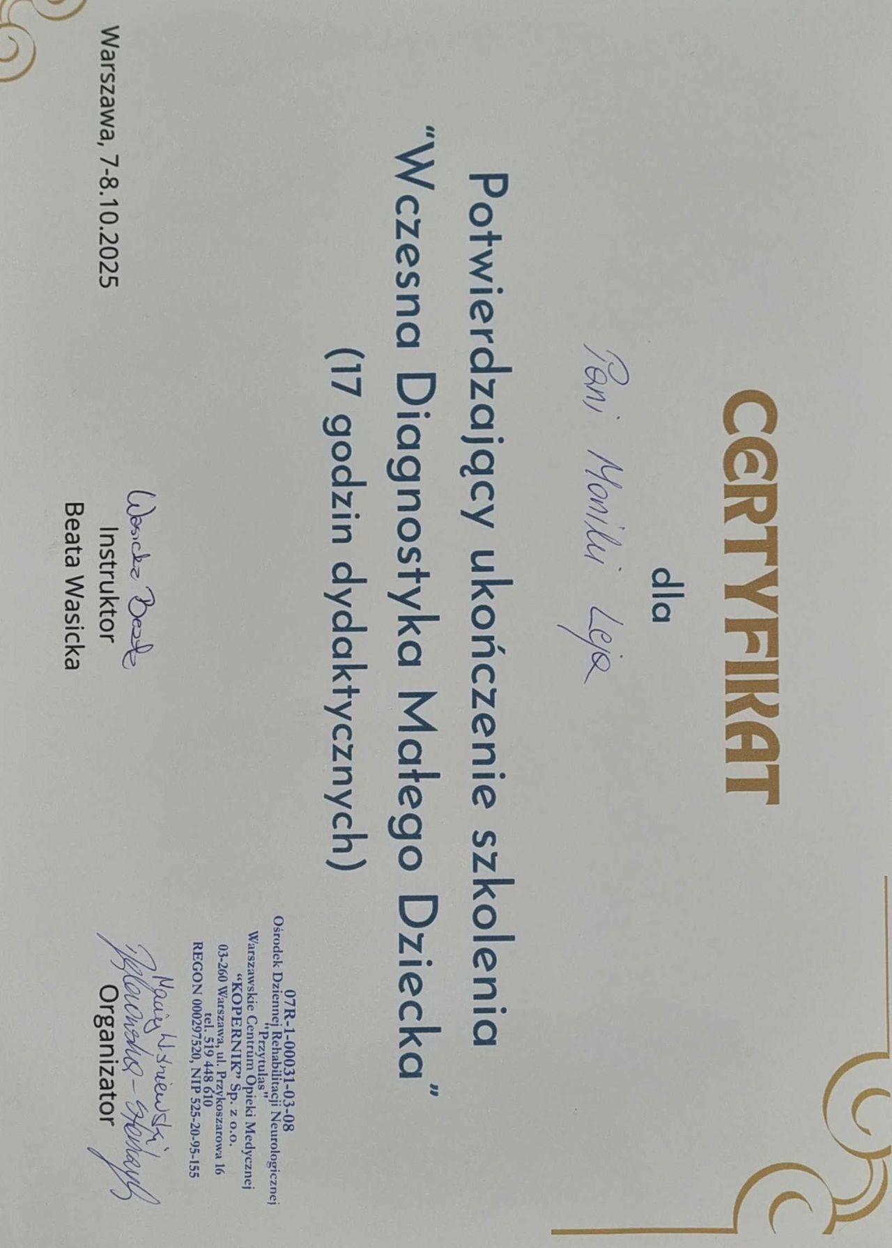 Jako fizjoterapeutka dziecięca wiem, jak ważne jest szybkie wykrycie nieprawidłowości w rozwoju ruchowym. W mojej pracy łączę delikatną terapię manualną z ćwiczeniami korygującymi, dbając przy tym, aby wizyta nie była dla dziecka stresująca.