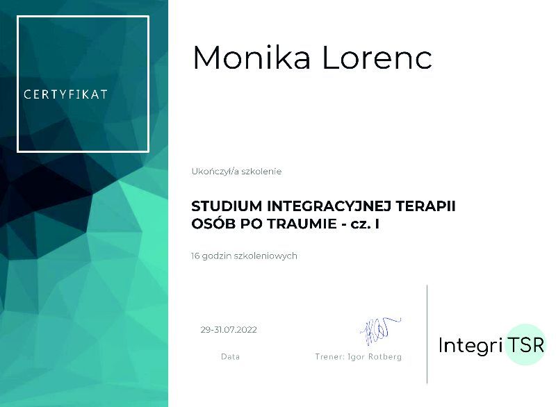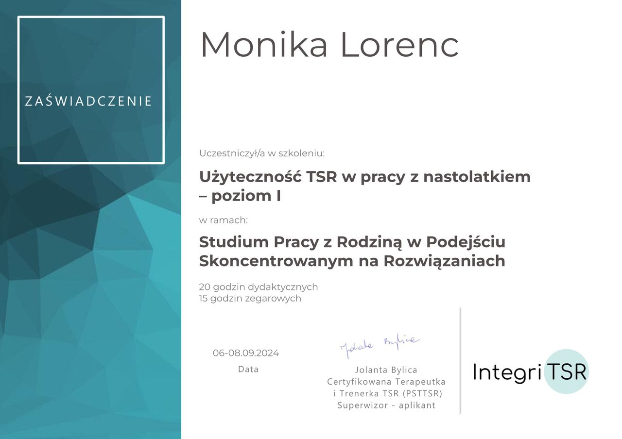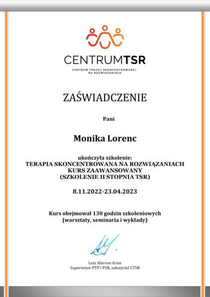 Pani Monika Lorenc to profesjonalna, empatyczna i bardzo uważna terapeutka. Praca w nurcie TSR oraz elementy coachingu dały mi realne wsparcie i konkretne narzędzia do zmiany. Dzięki terapii nauczyłem się lepiej dostrzegać i wykorzystywać własne zasoby, co pomogło mi w osiąganiu wyznaczonych celów i sukcesów. Spotkania odbywały się w atmosferze zaufania, bezpieczeństwa i pełnego zaangażowania. Zdecydowanie polecam Panią Monikę każdemu, kto szuka skutecznej i wspierającej pomocy.