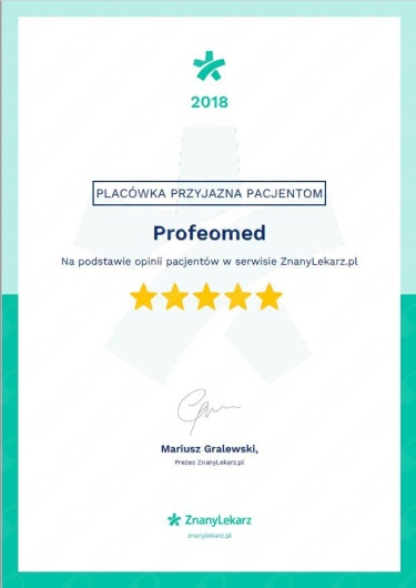 Administratorem danych osobowych jest ZnanyLekarz sp. z o.o. z siedzibą w Warszawie przy ul. Kolejowej 5/7. Informujemy, że po przekazaniu przez nas Twoich danych osobowych wybranemu przez Ciebie Profesjonaliście, staje się on również administratorem Twoich danych osobowych i przetwarza je w celach związanych ze świadczeniem usług medycznych lub innych podobnych.