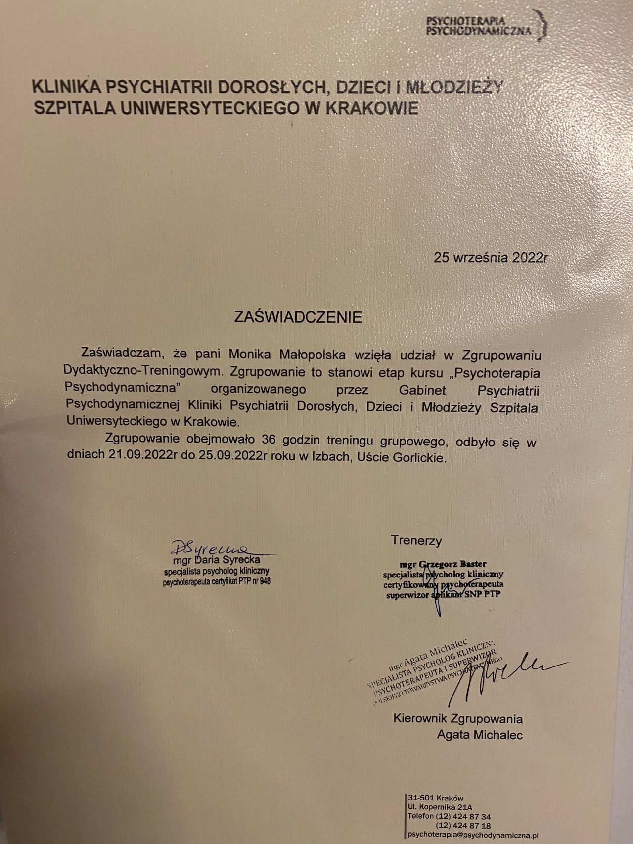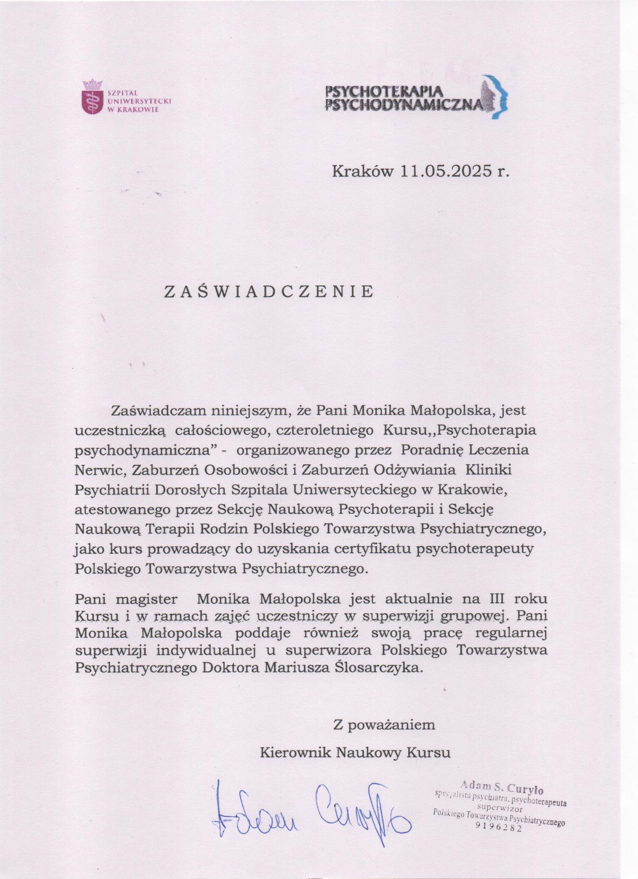 Jestem psychoterapeutą z nurtu psychodynamicznego. Jest to terapia wglądowa, pozwalająca lepiej zrozumieć swoje zachowania i otaczający świat, dająca trwałe efekty. Obecnie w trakcie kursu organizowanego przez Poradnię Leczenia Nerwic, Zaburzeń Osobowości i Zaburzeń Odżywiania Kliniki Psychiatrii Dorosłych Szpitala Uniwersyteckiego w Krakowie (kurs jest akredytowany przez Polskie Towarzystwo Psychiatryczne), doświadczenie zawodowe zdobywałam podczas 10 miesięcy staży klinicznych w Szpitalu Uniwersyteckim im. Kopernika (oddział młodzieżowy) oraz w Szpitalu Klinicznym im. Babińskiego (Oddział Leczenia Nerwic i Zaburzeń Osobowości ). Ukończyłam również kurs Podstawy Psychoterapii Psychoanalitycznej w Krakowskiej Szkole Psychoterapii Psychoanalitycznej. Jestem członkinią Polskiego Towarzystwa Psychiatrycznego oraz Sekcji Naukowej Psychoterapii, swoją pracę poddaję superwizji indywidualnej i grupowej.