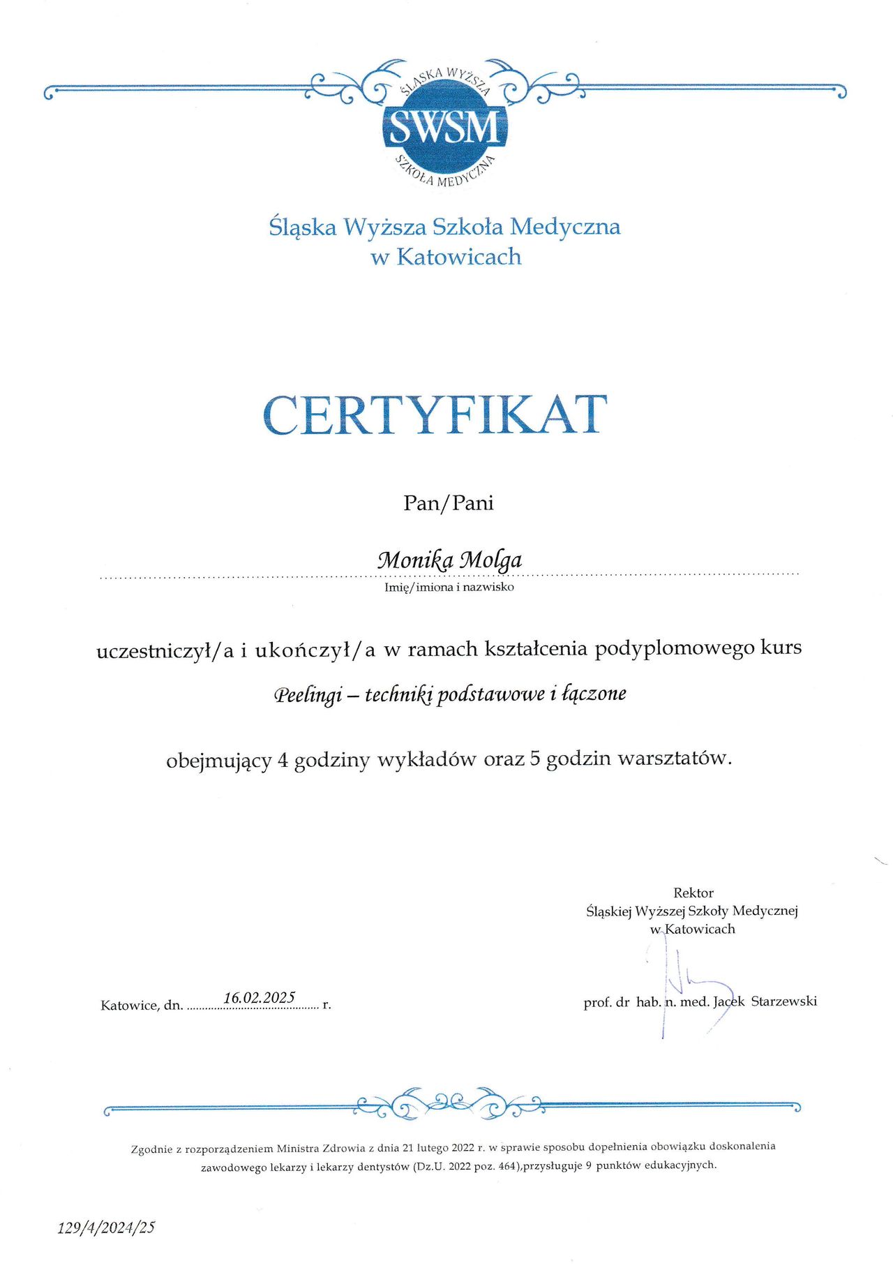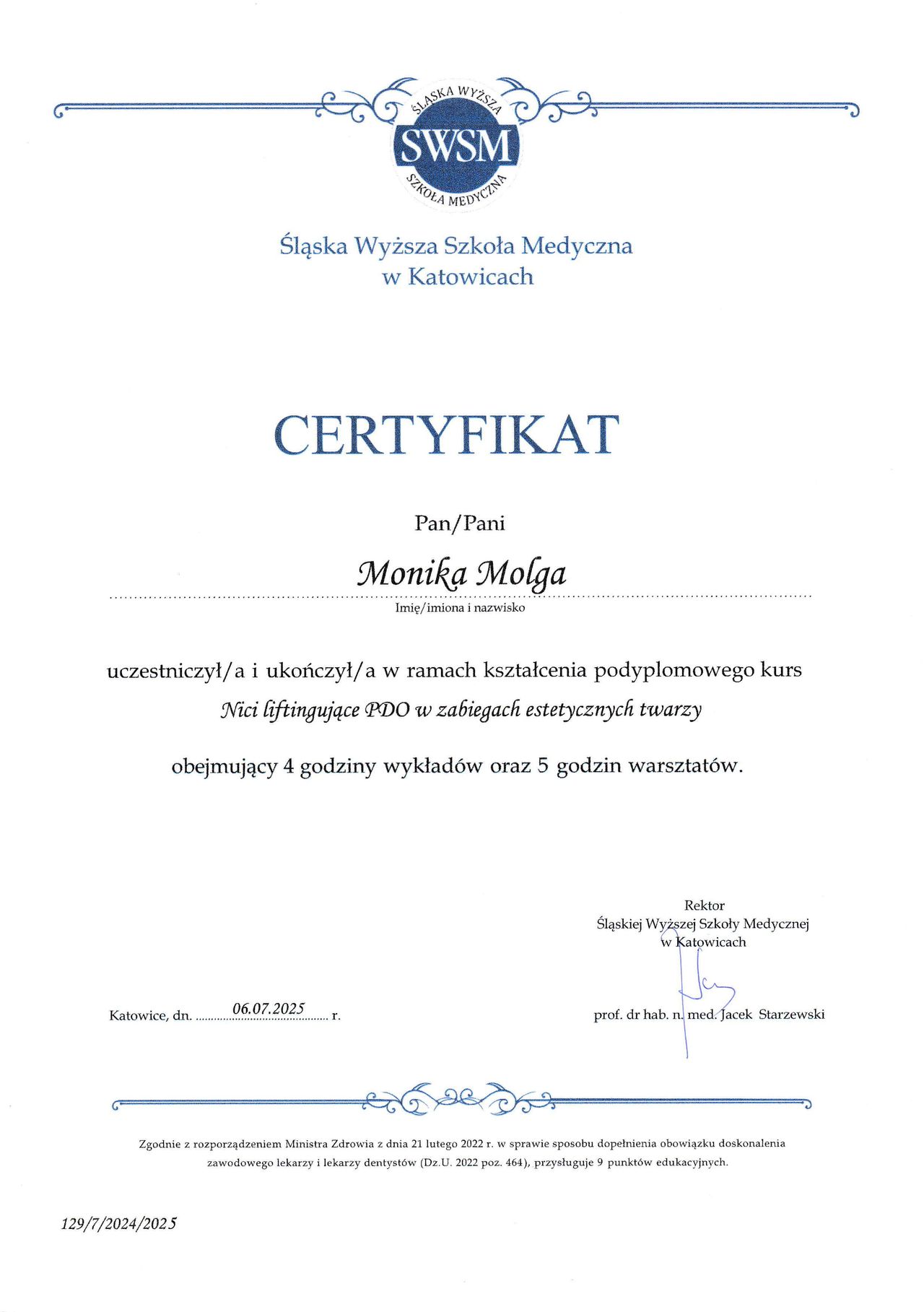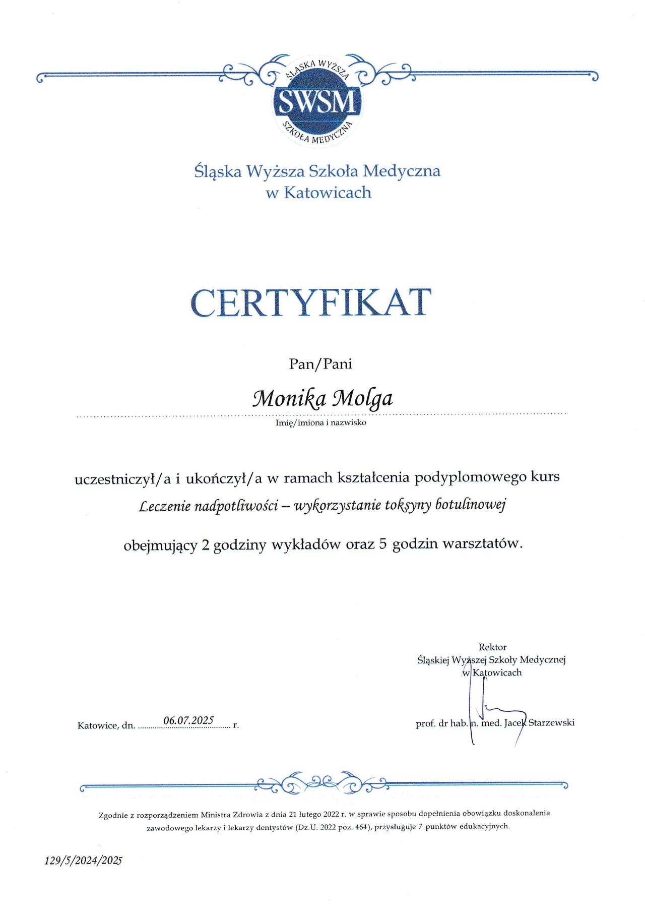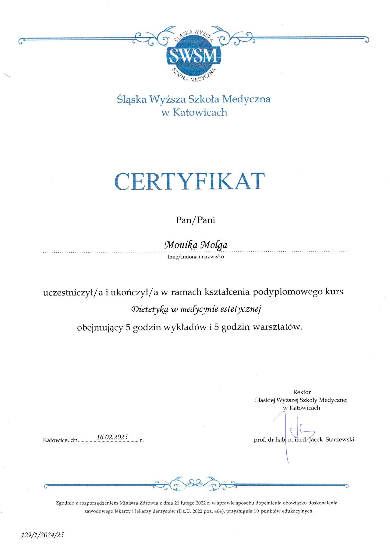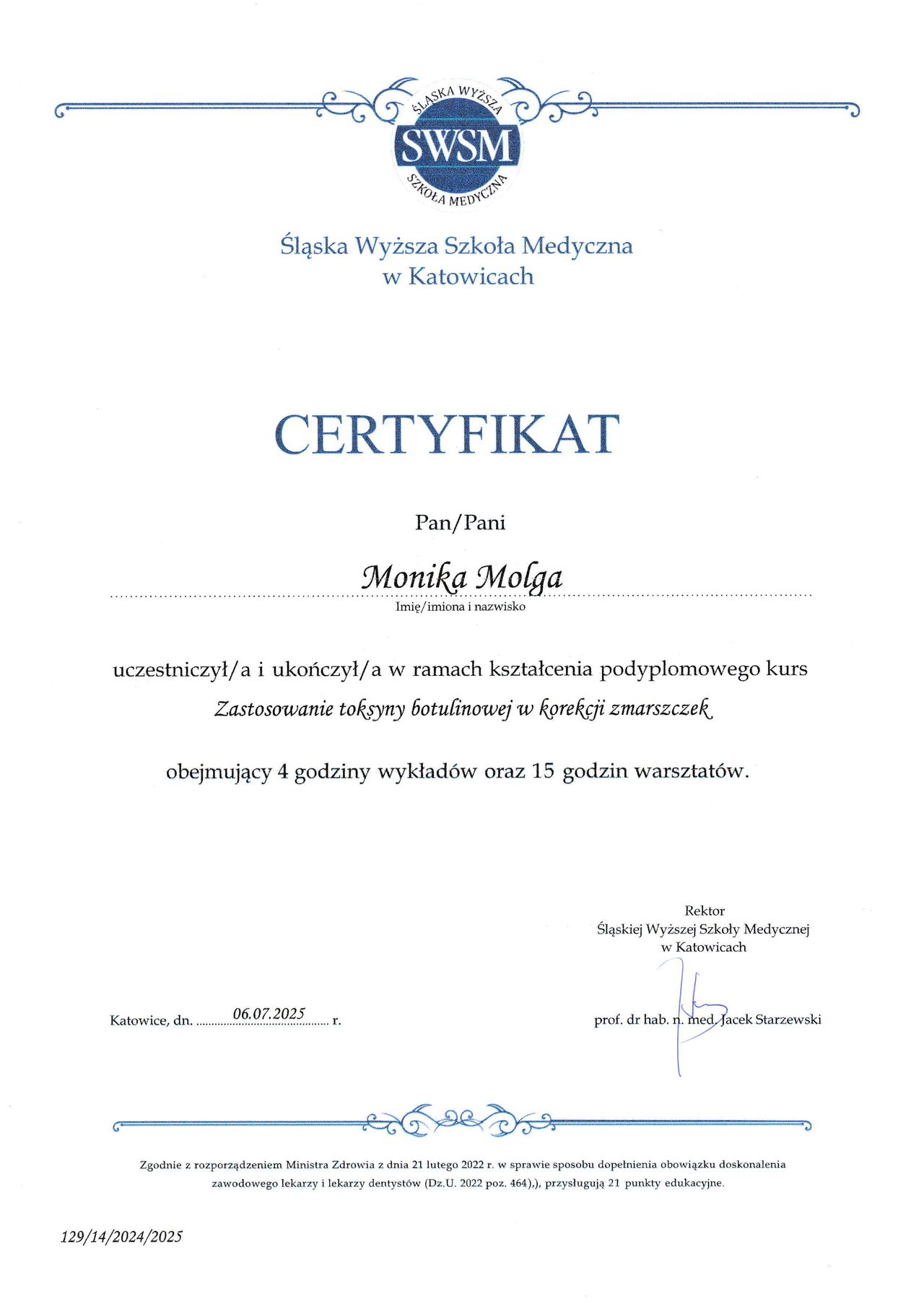 Ukończyłam studia medyczne w Krakowie, a następnie kształciłam się w zakresie medycyny estetycznej w Śląskiej Wyższej Szkole Medycznej w Katowicach.