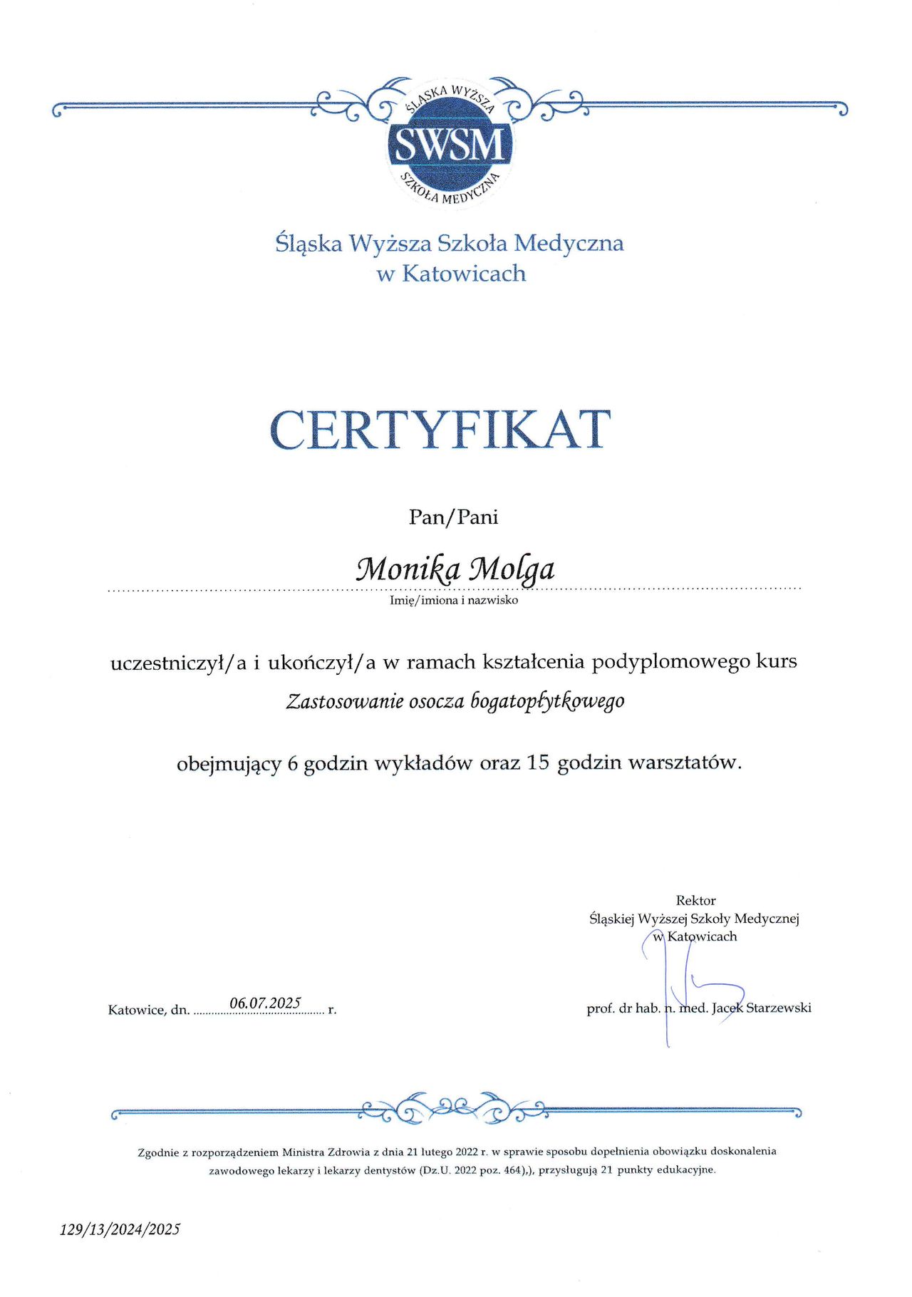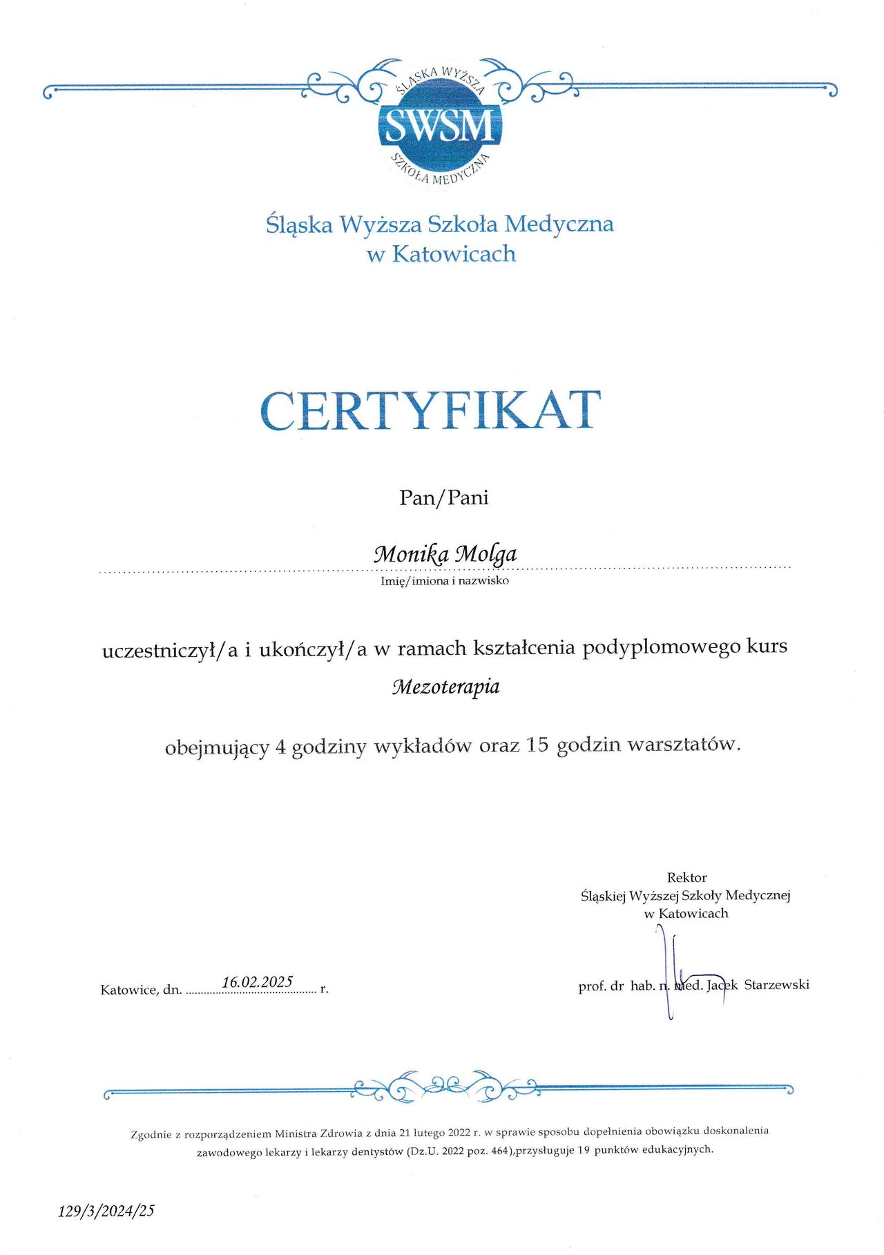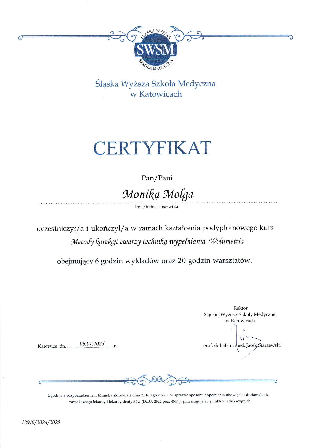 Medycyna estetyczna to moja pasja - daje mi możliwość łączenia wiedzy medycznej z troską o dobre samopoczucie i pewność siebie moich pacjentów. Największą satysfakcję sprawia mi, gdy po zabiegach widzę nie tylko subtelne zmiany w wyglądzie, ale także uśmiech i większą pewność siebie. Każdy pacjent jest dla mnie wyjątkowy, dlatego przykładam dużą wagę do rozmowy, poznania potrzeb i dobrania odpowiednich metod. Regularnie podnoszę swoje kwalifikacje uczestnicząc w kursach i szkoleniach, aby móc oferować najnowocześniejsze i sprawdzone metody zabiegowe.