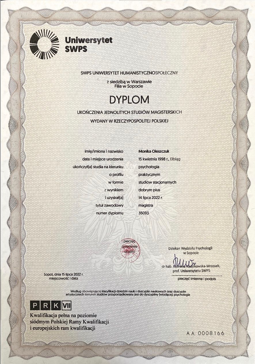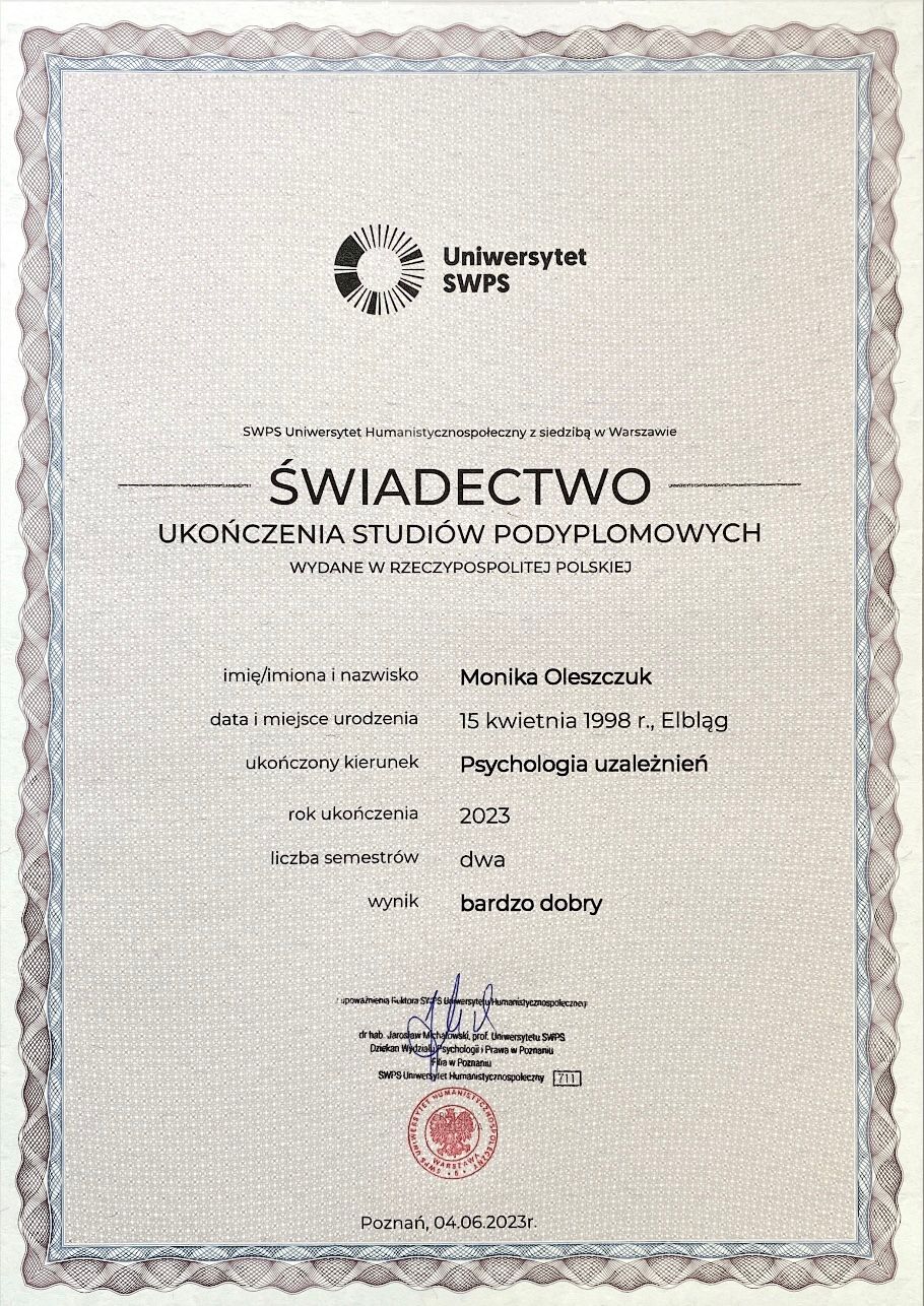 Ukończyłam jednolite studia magisterskie z psychologii na Uniwersytecie SWPS w Sopocie oraz studia podyplomowe z psychologii uzależnień na Uniwersytecie SWPS w Poznaniu.
