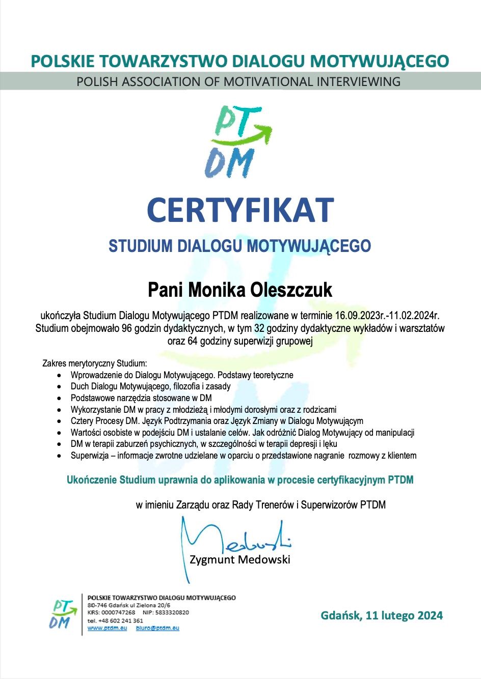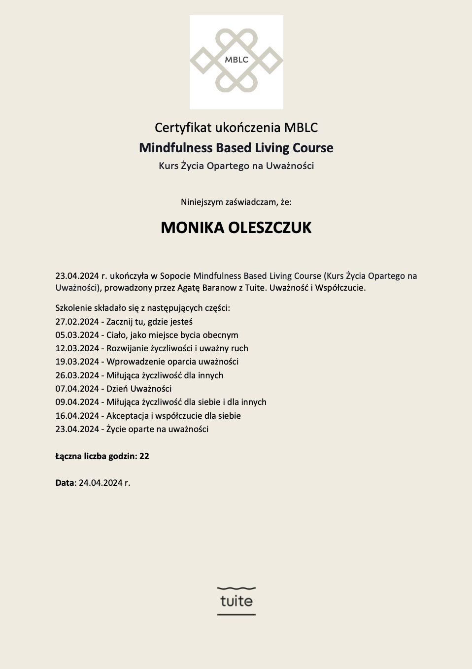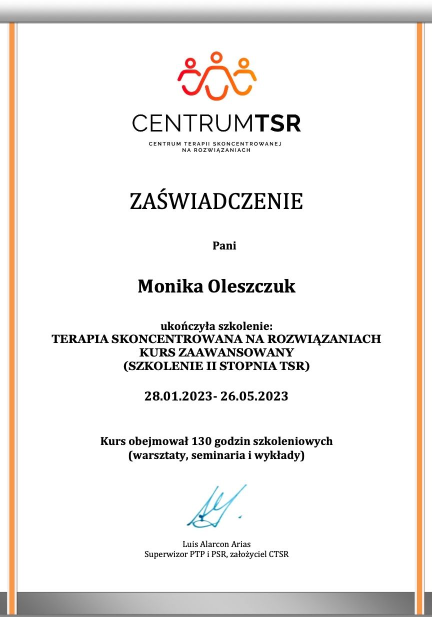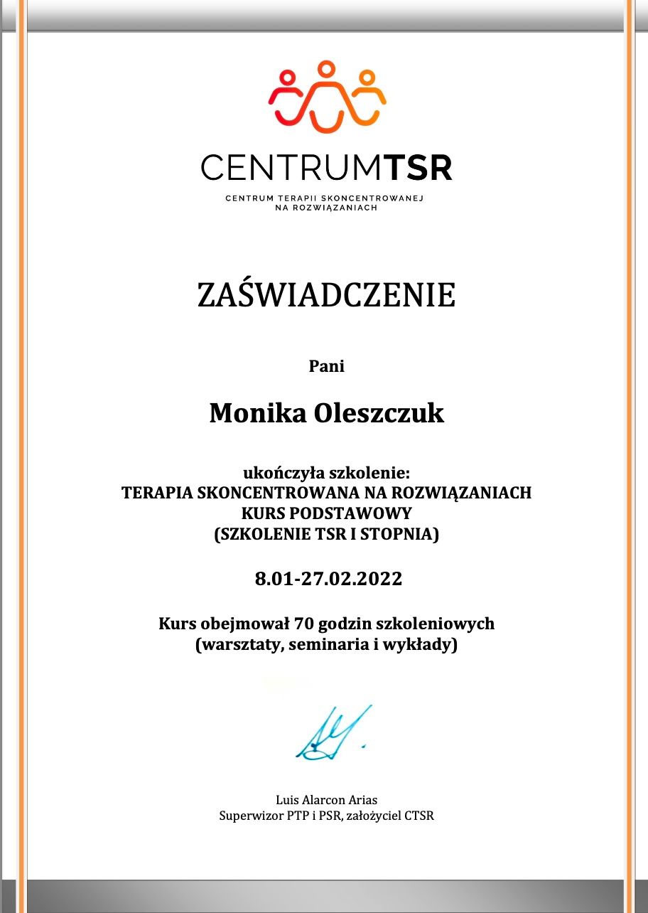 Ukończyłam szkolenie I i II stopnia Terapii Skoncentrowanej na Rozwiązaniach (TSR) oraz studium Dialogu Motywującego (PTDM). Ukończyłam kurs Mindfulness MBLC “Życie w Uważności” wg. Mindfulness Association.