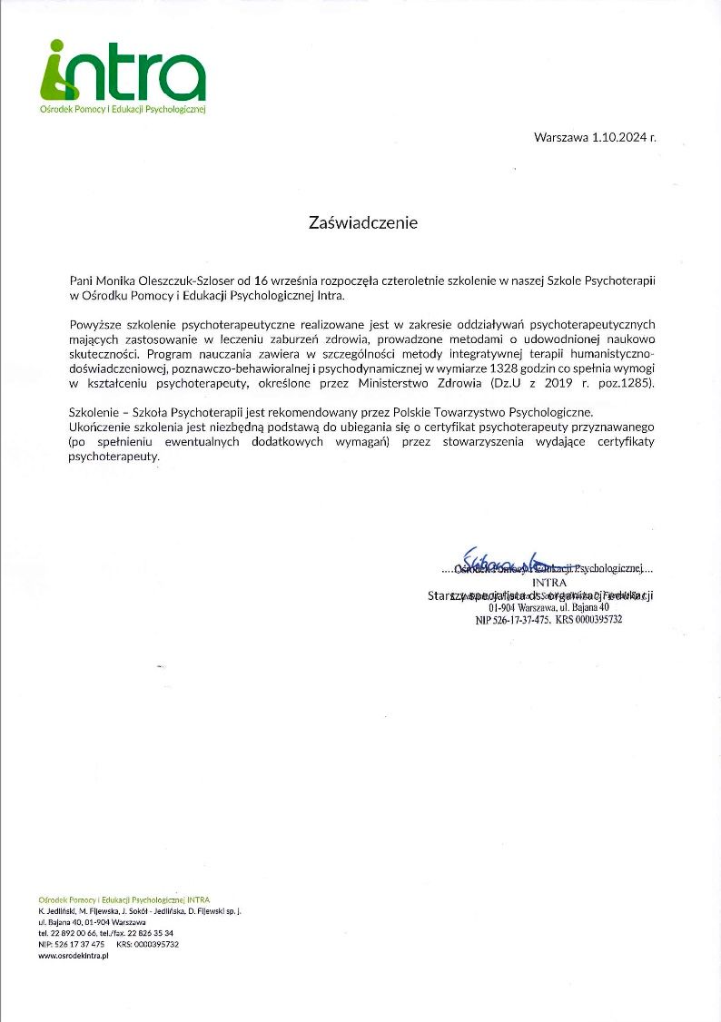 Jestem psychologiem w trakcie całościowego, 4-letniego szkolenia psychoterapeutycznego w Szkole Psychoterapii INTRA, rekomendowanej przez Polskie Towarzystwo Psychologiczne.