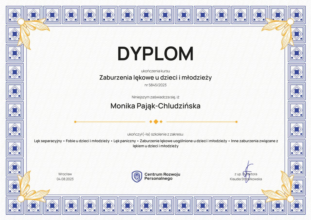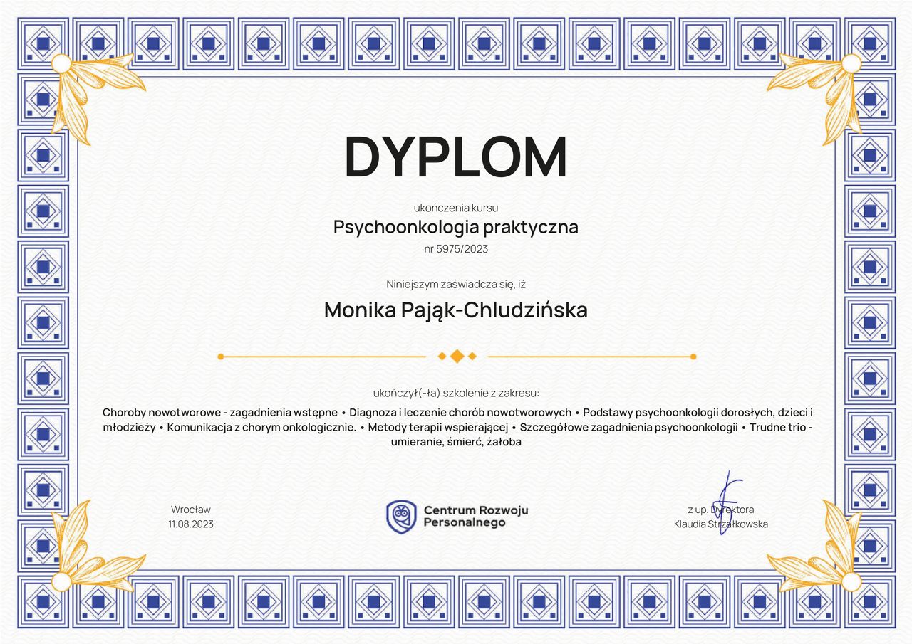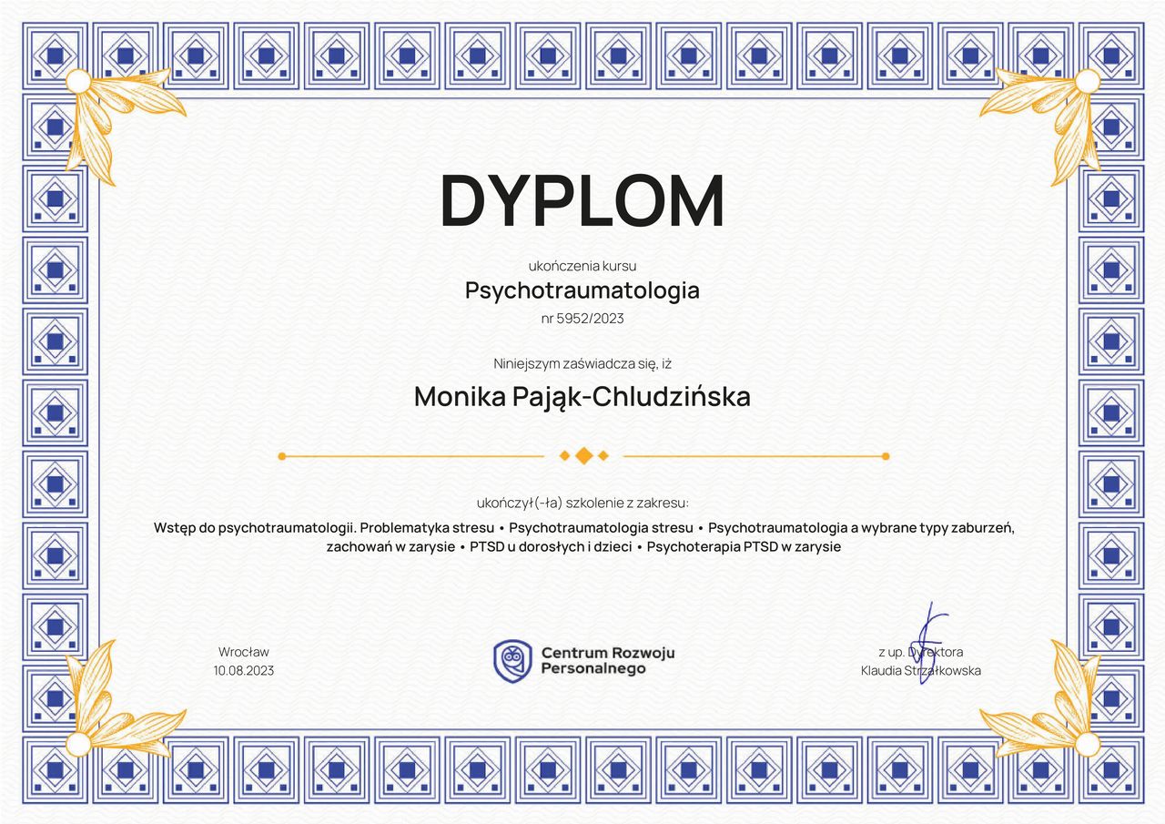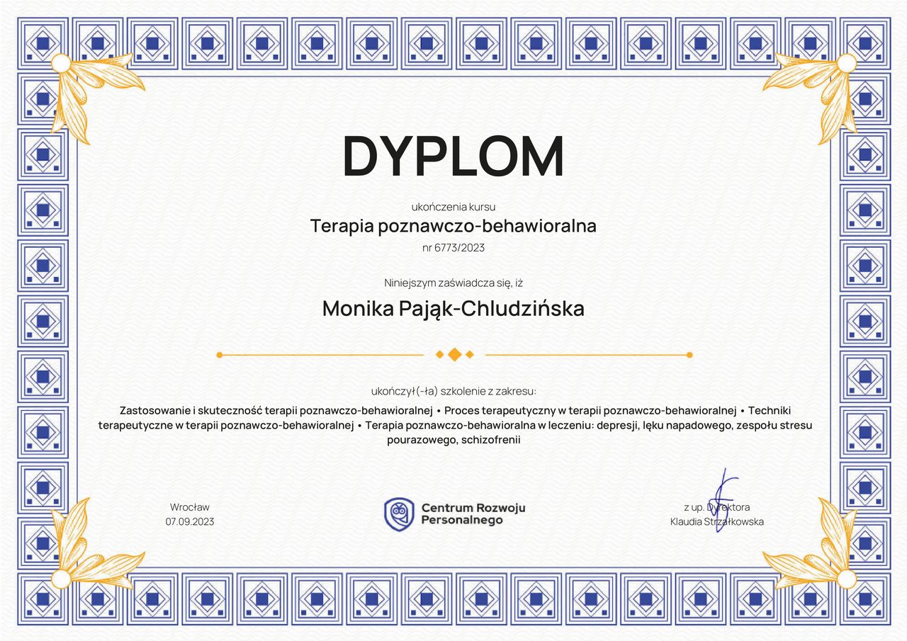 Jaki jest zakres porad oferowanych przez Monika Pająk-Chludzińska?Monika Pająk-Chludzińska to psycholog, psychoterapeuta. Na podstawie swojego doświadczenia i wykształcenia Monika Pająk-Chludzińska oferuje usługi takie jak: Konsultacja psychologiczna.