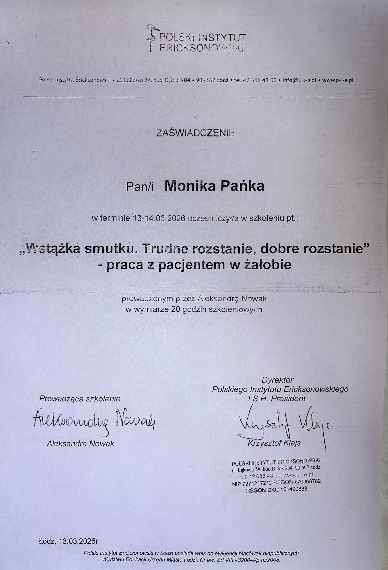 Do Pani Moniki uczęszczam już od roku. Zgłosiłam się z potrzebą m.in. przepracowania/ przejścia żałoby po stracie bliskiej osoby. Już od pierwszego spotkania czułam się w gabinecie bezpiecznie i komfortowo. Każda sesja wnosiła coś innego, czułam się wysłuchana i wychodziłam z nadzieją. Dzięki wspólnej pracy, po ponad roku mogłam odstawić leki przepisane wcześniej przez psychiatrę, bez powrotów do poprzednich stanów