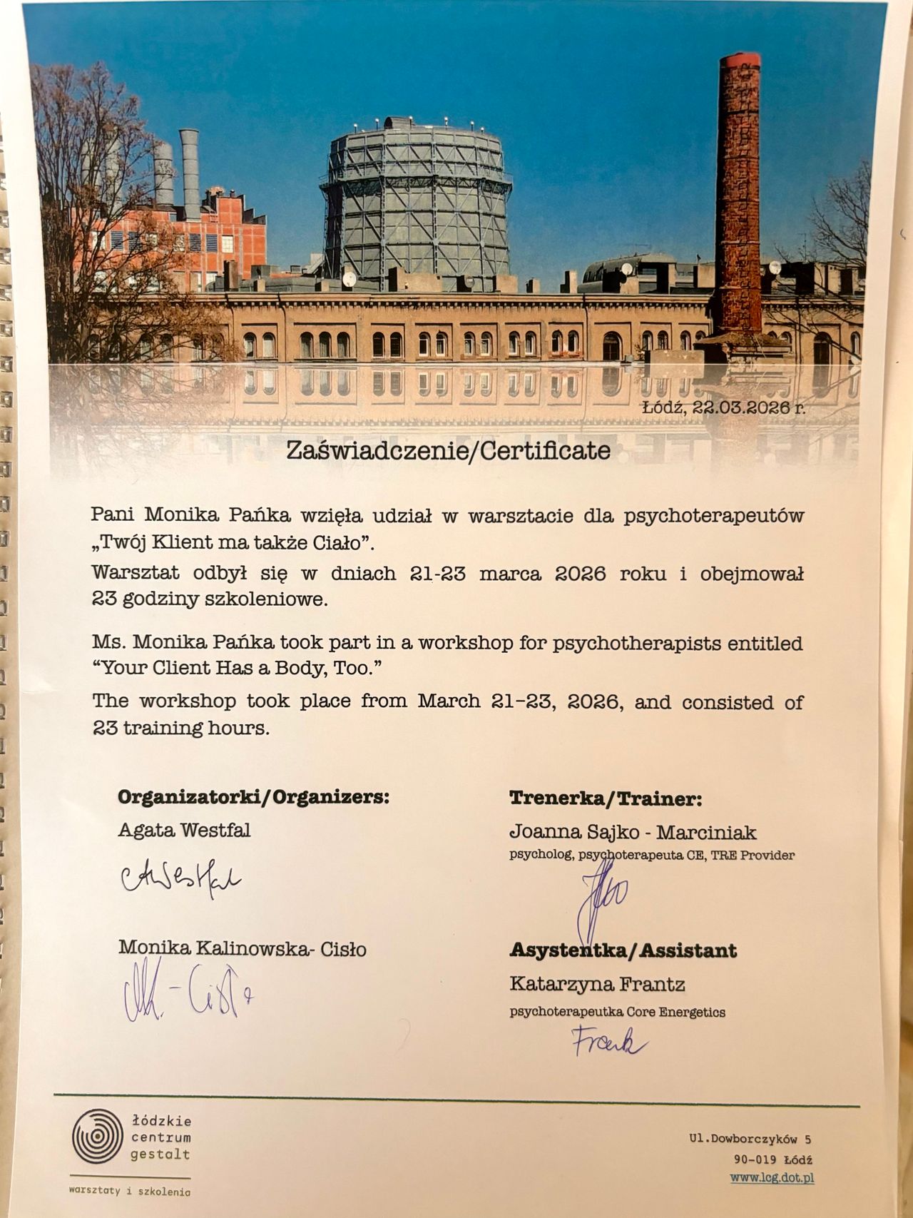 Ukończyłam 5 letnie studia magisterskie na kierunku Psychologia UAM w Poznaniu oraz 4,5 letni Kurs Psychoterapii w Instytucie Ericksonowskim, atestowany przez Sekcję Naukową Psychoterapii Polskiego Towarzystwa Psychiatrycznego.