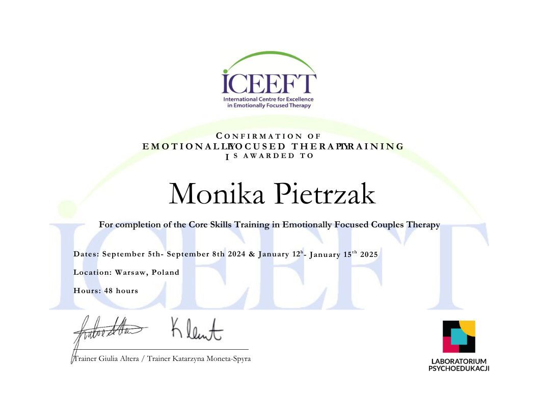 Wykształcenie Ukończyłam studia z psychologii pozytywnej na SWPS w Sopocie oraz specjalistyczne całościowe szkolenie terapii par skoncentrowanej na emocjach EFCT prowadzone w Laboratorium Psychoedukacji przez dr. Leanne Campbell z Katarzyną Monetą Spyrą, akredytowane przez ICEEFT. Ukończyłam całościowe 4 letnie szkolenie z psychoterapiI w Instytucie Integralnej Terapii Gestalt w Krakowie.
