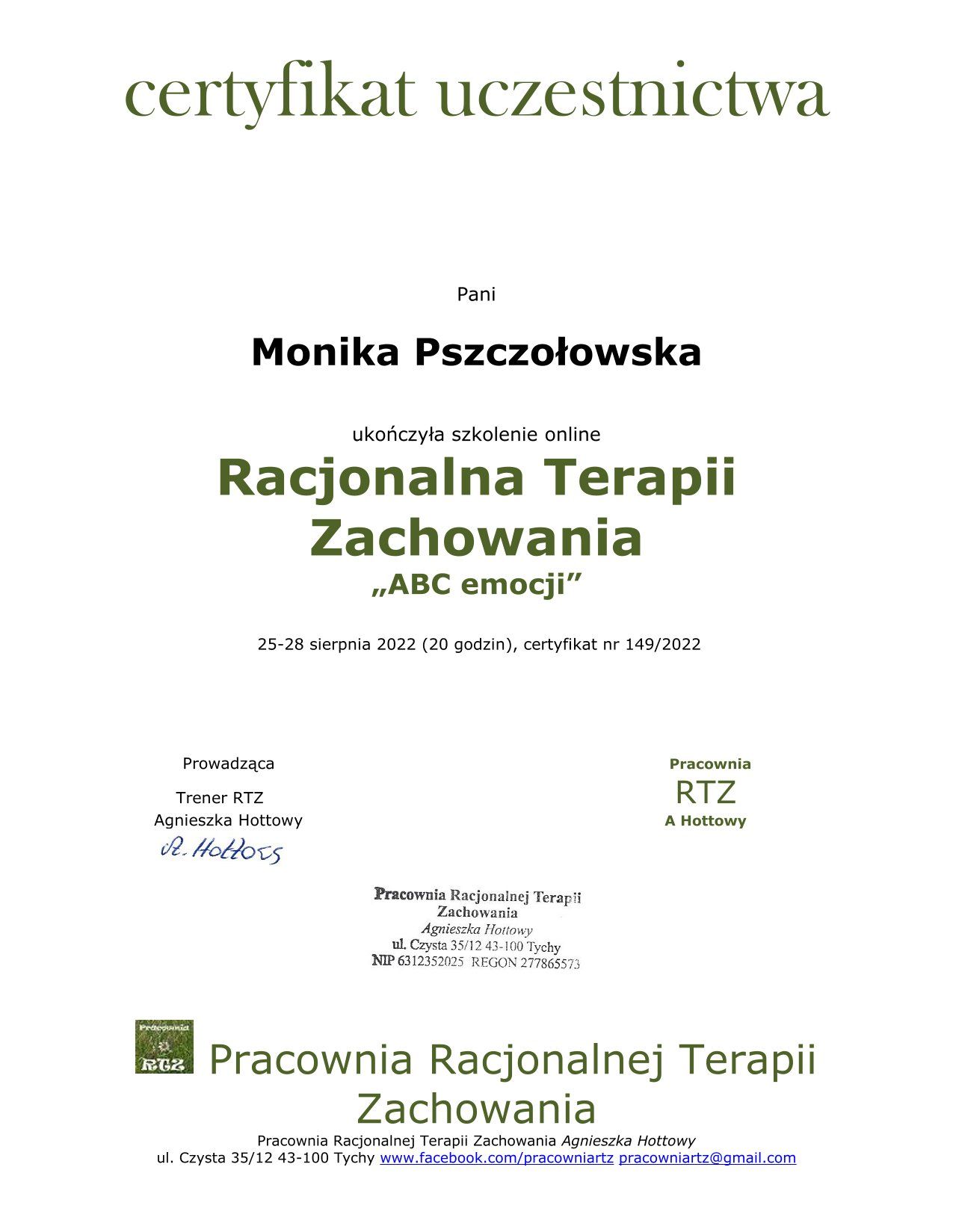 Pomagam również osobom po doświadczeniach traumatycznych. Ukończyłam kurs Racjonalnej Terapii Zachowań (RTZ), co pozwala mi wspierać pacjentów w pracy nad zmianą destrukcyjnych przekonań i budowaniem bardziej adaptacyjnych sposobów myślenia.