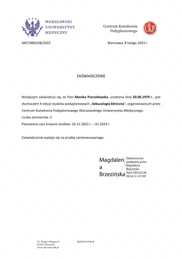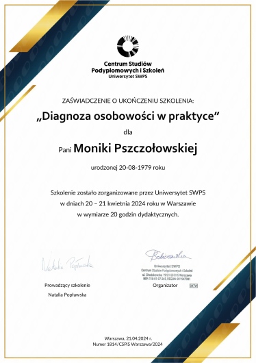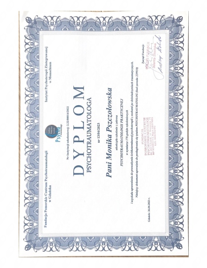 Jestem psychologiem i psychotraumatologiem (tytuł uzyskany we współpracy z Instytutem Psychoterapii Zintegrowanej w Monachium) oraz absolwentką seksuologii klinicznej Warszawskiego Uniwersytetu Medycznego. Aktualnie uczestniczę w czteroletnim kursie psychoterapii przygotowującym do uzyskania certyfikatu psychoterapeuty Polskiego Towarzystwa Psychiatrycznego. Jestem członkinią Polskiego Towarzystwa Psychiatrycznego, a swoją pracę regularnie poddaję superwizji.