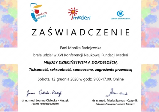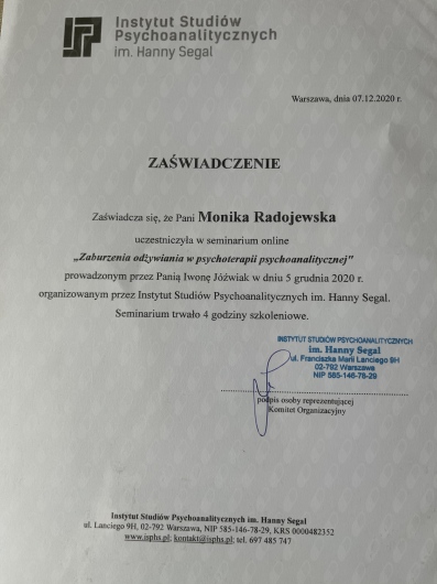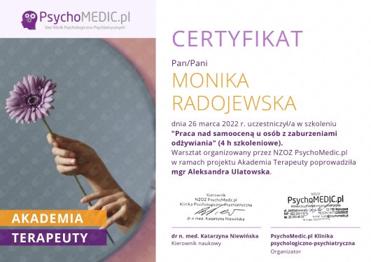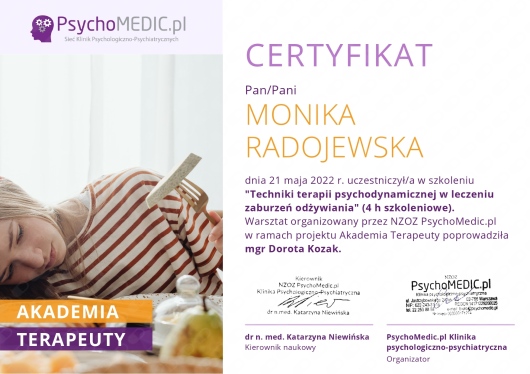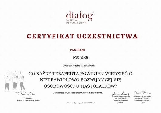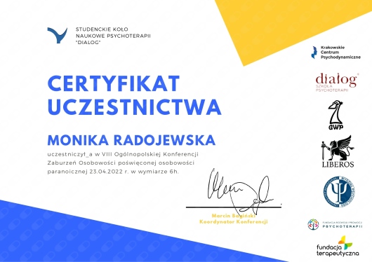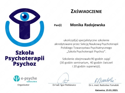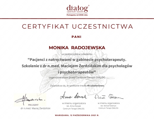 Jestem na początku procesu terapeutycznego, natomiast z pełnym przekonaniem polecam terapię u Pani Moniki Radojewskiej osobom, poszukującym terapeuty zaangażowanego, uważnego i doświadczonego w prowadzeniu terapii leczenia zaburzeń osobowości.