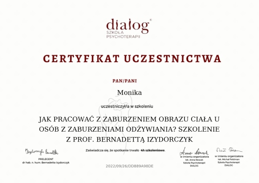 Współpracuję z Panią Moniką już długi czas i nie mogę wyrazić swojego podziękowania względem postępu jakie poczyniłyśmy na przestrzeni miesięcy pracy. W odróżnieniu o wielu innych specjalistów, Pani Monika nie narzuca swojej wiedzy jako jedynej prawdy, a stara się wytłumaczyć i prowadzić dialog z pacjentem zamiast monologu który brzmi jak pouczanie…. Ze swojej strony jestem bardzo zadowolona dotychczasowym postępem i jestem bardzo optymistyczna na dalsze efekty które przyniesie kontynuowanie wspólnej terapii. Niezmiernie dziękuję!