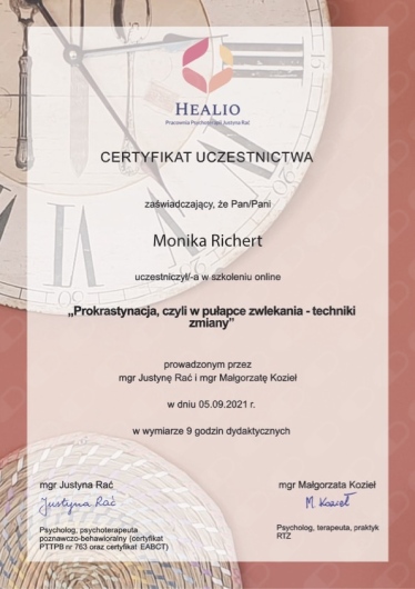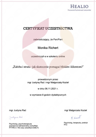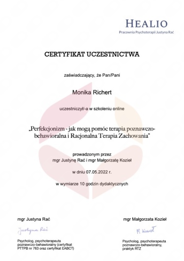 Serdecznie polecam Panią Monikę, z którą miałam przyjemność współpracować. Jest to osoba o ogromnej wiedzy, profesjonalizmie i niezwykłych kompetencjach, co widać w każdym aspekcie jej pracy. Posiada wieloletnie doświadczenie, które w połączeniu z jej zaangażowaniem czyni terapię naprawdę skuteczną. Warto docenić również wyjątkowe podejście – pełne empatii, zrozumienia i autentycznego ciepła. W trakcie naszych spotkań czułam się nie tylko jako pacjentka, ale przede wszystkim jako człowiek, którego emocje i potrzeby są naprawdę ważne. Dzięki tej współpracy mogłam zrozumieć samą siebie i odzyskać wewnętrzną równowagę. Z całego serca polecam każdemu, kto szuka wsparcia na wysokim poziomie, a jednocześnie pełnego zrozumienia i zaangażowania.