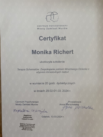 Jestem certyfikowaną psychoterapeutką poznawczo-behawioralną (PTTPB nr. 1799) oraz członkinią Polskiego Towarzystwa Terapii Poznawczo-Behawioralnej. W swojej pracy wykorzystuję podejścia oparte na terapii schematów oraz terapii akceptacji i zaangażowania (ACT), co pozwala mi na skuteczne wsparcie pacjentów w pokonywaniu trudności. Od 2020-2024 roku byłam związana z Centrum Psychoterapii Mosty zamiast Murów. Gdzie zajmowałam się diagnozą osób dorosły i młodzieży. Prowadziłam indywidualną oraz grupową terapię w nurcie poznawczo-behawioralnym.