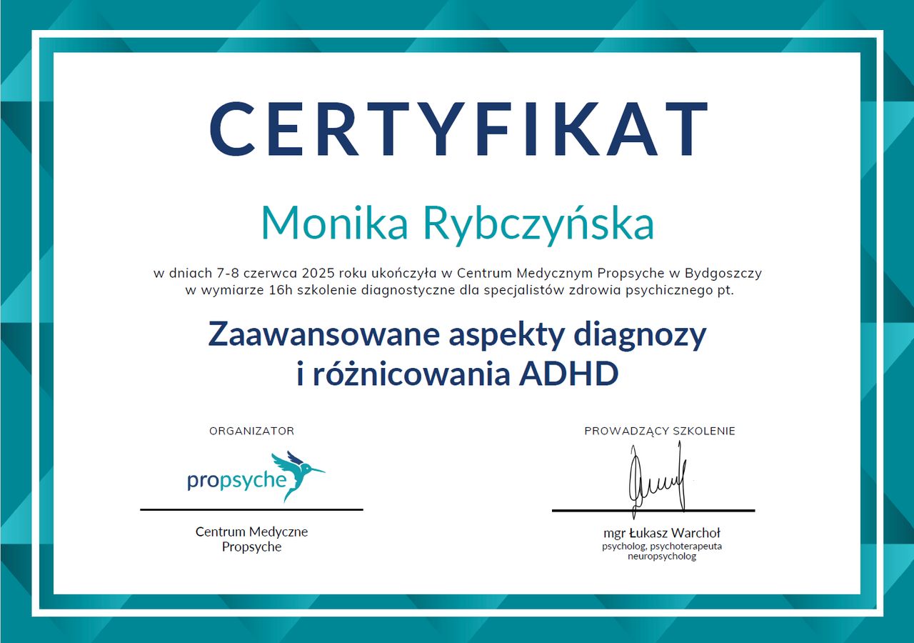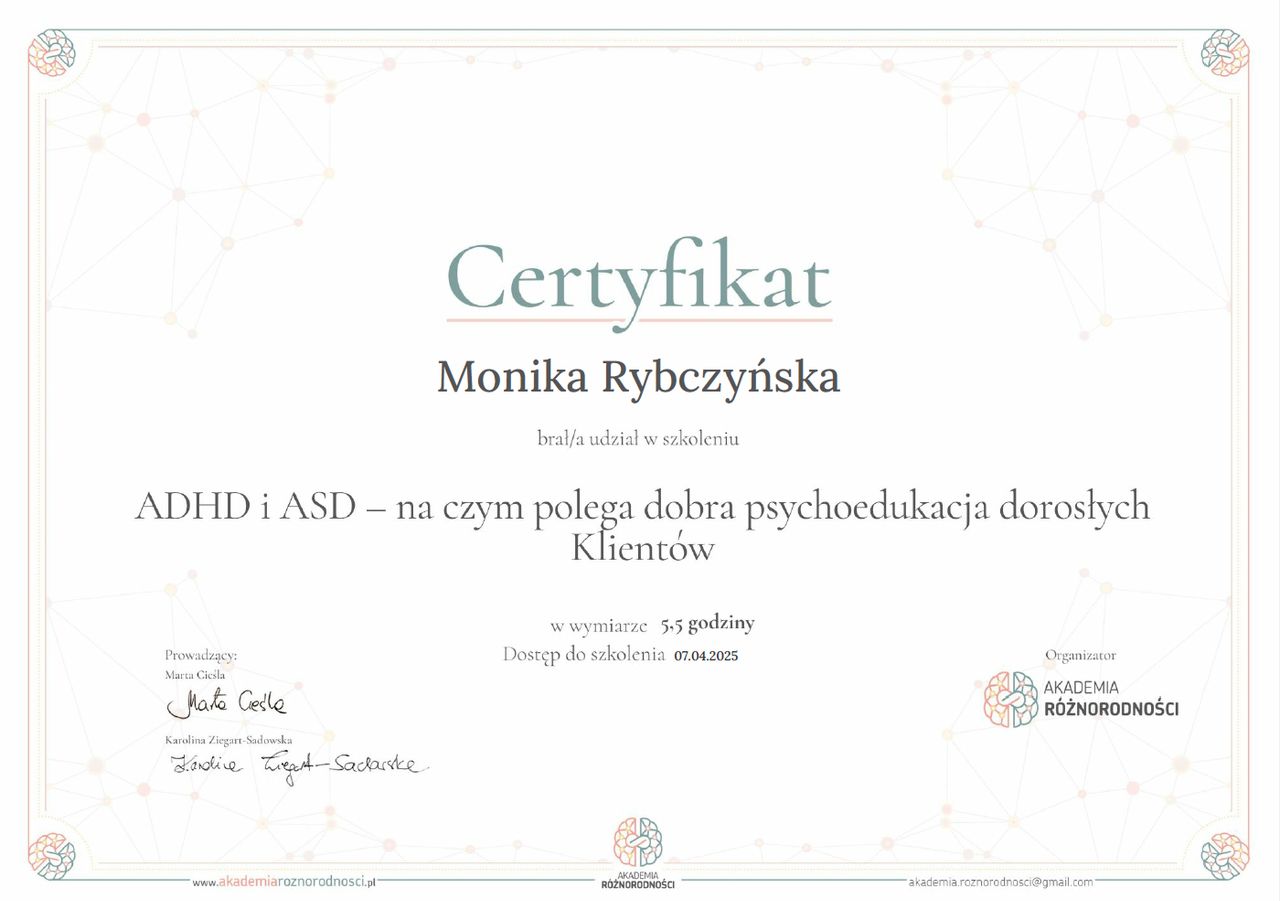 U Pani Moniki diagnozowałam ADHD i bardzo polecam:) Pani Monika jest wnikliwa, rzetelna, spotkania przebiegały w sympatycznej, przyjaznej atmosferze, punktualnie, elastycznie, czułam się zrozumiana, spostrzeżenia Pani Moniki były pomocne, a wydana opinia diagnostyczna bardzo trafnie opisywała rzeczywistą sytuację.
