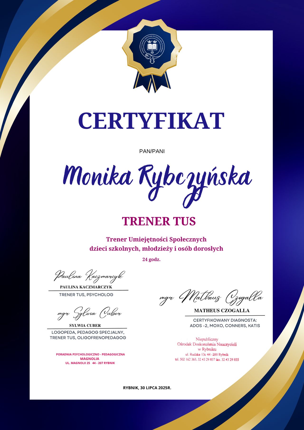 Pani Monika, jest miłą, pełną empatii osobą. Odbyłem kilka spotkań z których każde przebiegało w miłej i przyjaznej atmosferze, atmosferze spokoju, gdzie szybko znikał początkowy stres z mojej strony. Zawsze przygotowana i zaangażowana w spotkanie. Mogłem otwarcie podzielić się swoimi myślami i odczuciami licząc na zrozumienie. Wielu z nas potrzebuje różnego rodzaju wsparcia w wielu aspektach życia, szczerze polecam wizytę i współpracę z Panią mgr Moniką Rybczyńską.