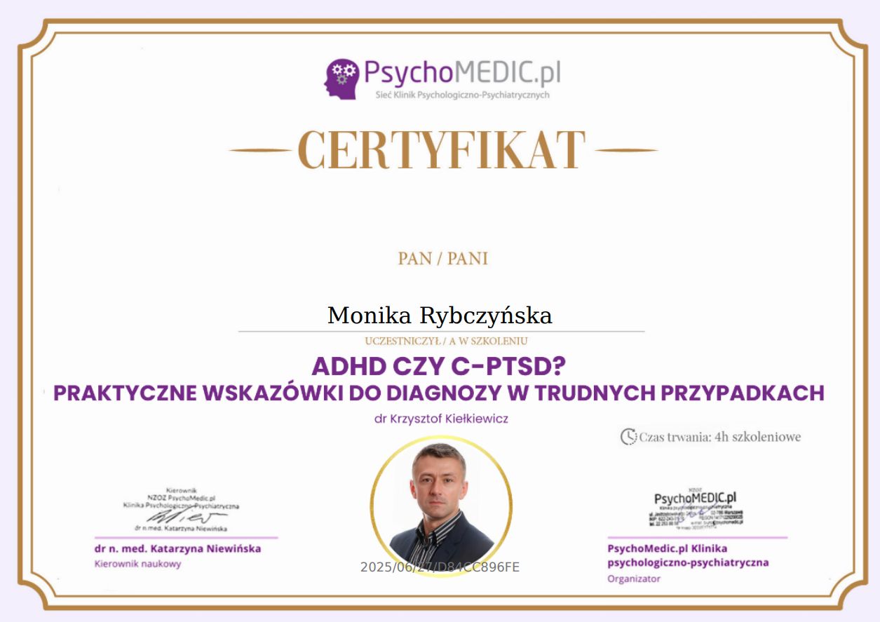 Byłam na wizycie u Pani Moniki w związku z diagnozą ADHD. Już od pierwszego momentu poczułam się bardzo komfortowo – Pani jest niezwykle sympatyczna, empatyczna i profesjonalna. W trakcie spotkania panowała spokojna, bezpieczna atmosfera, która pozwoliła mi swobodnie mówić o swoich trudnościach. Pani Psycholog przeprowadziła dokładny wywiad, wszystko jasno tłumaczyła i traktowała mnie z pełnym zrozumieniem. Czułam się naprawdę wysłuchana i zaopiekowana. Z całego serca polecam – to specjalistka z ogromnym taktem i zaangażowaniem.